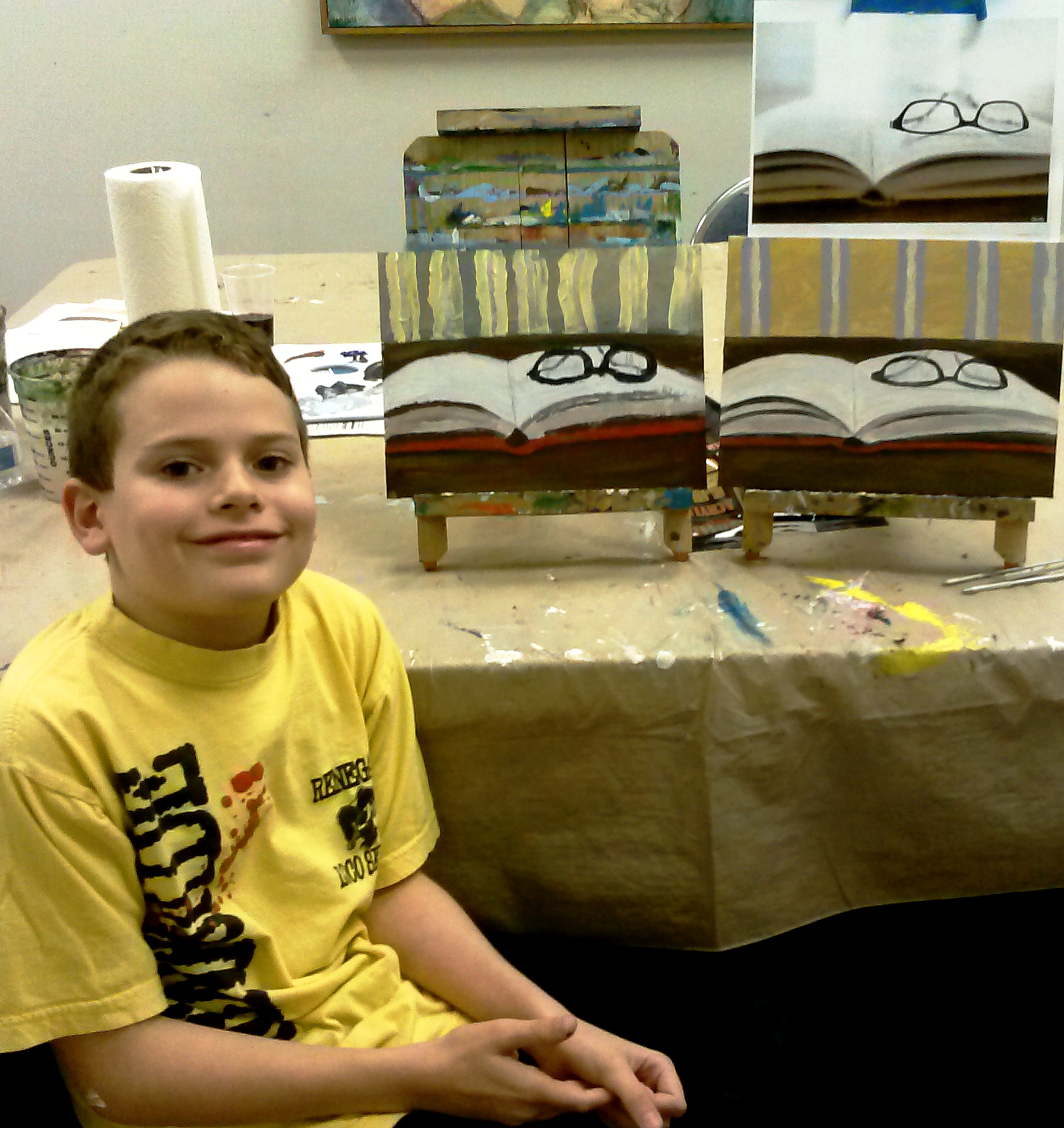 As I continue to work on the book series (I haven’t given up…just been misdirected for a week or so) we decided to paint a book with my young student yesterday. Here is Ethan with a wonderful painting of an open book and glasses. We painted side by side so you see his version on the left, mine on the right and the reference photo above my painting.