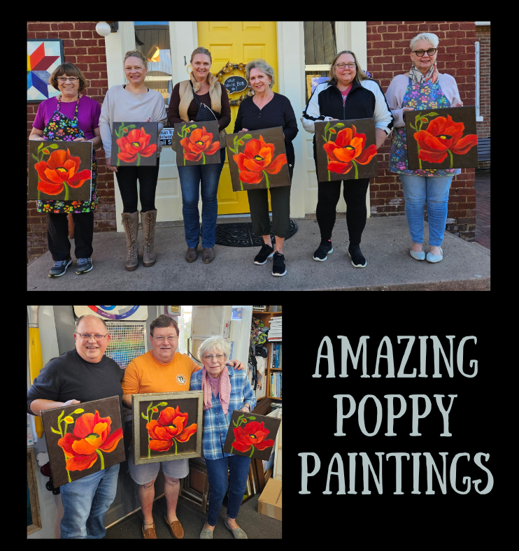 I don’t know how you can look at these amazing poppy paintings and not regret coming to paint one yourself! Aren’t they terrific???!!!! And we had a couple of ladies who had not painted before join us and they did GREAT! Don’t miss out on the beautiful paintings we have coming up. Check them out here.