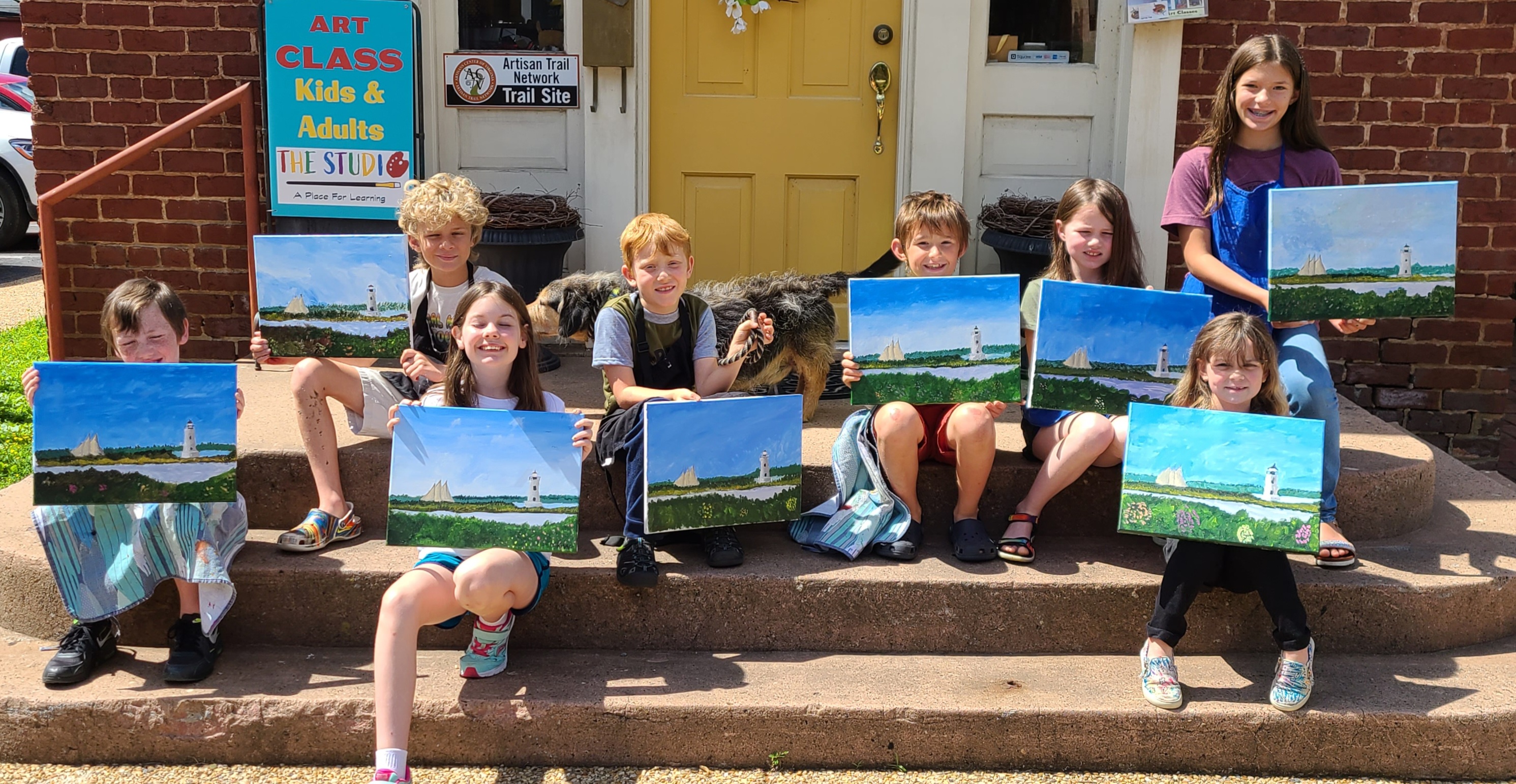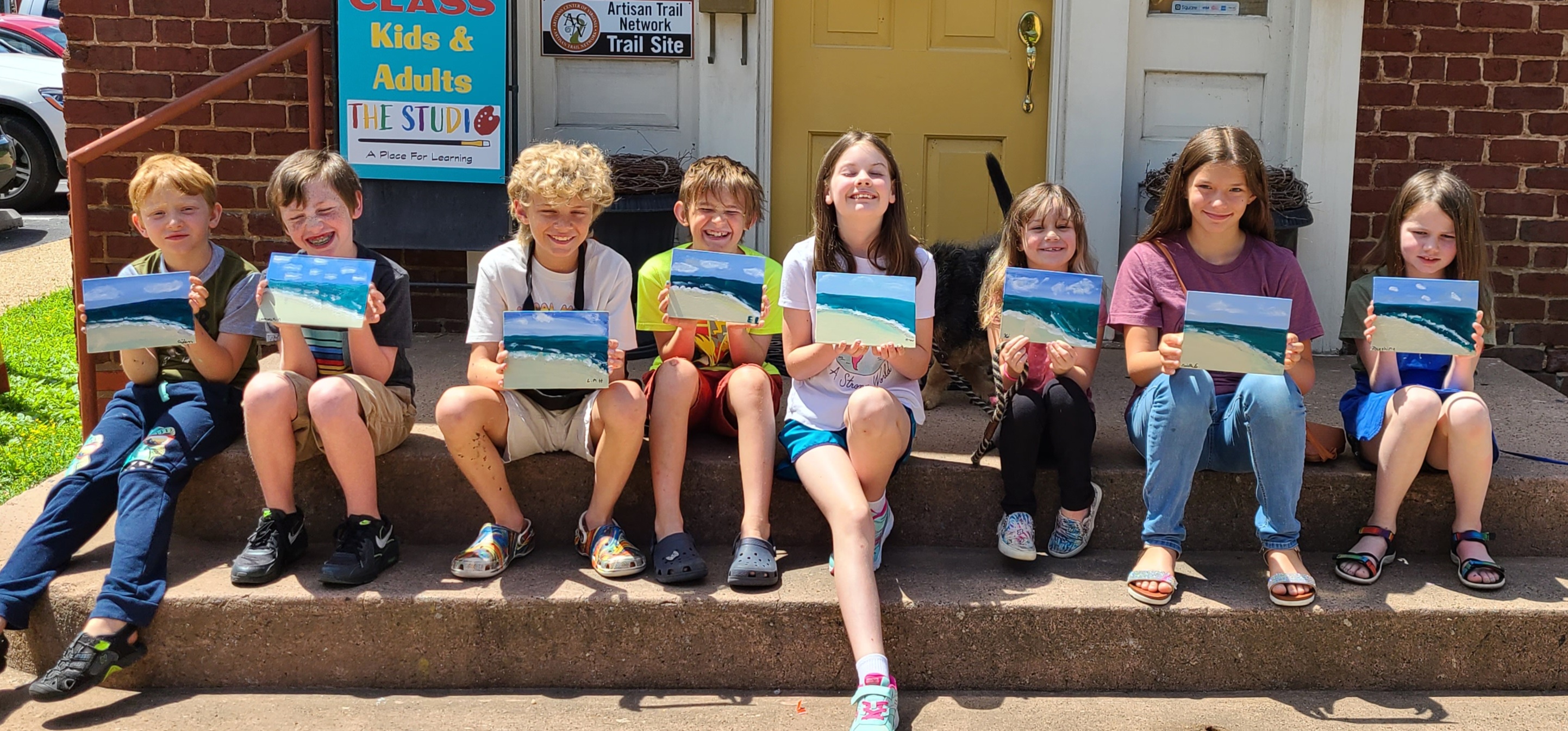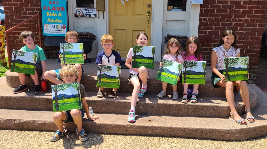 The first session of Art Camp started yesterday at The Studio with a large group of really enthusiastic and terrific painters. All but one have painted with me before so we got off to a great start with a review of the color wheel, value, and color mixing. And didn’t the do a fabulous job on these landscape paintings. Our theme this week is “Land and Sea”. You know they will be creating many more terrific works of art. We have several sessions of camp still available this summer. Click here to register your young artist so they can enjoy creating and learning about art.