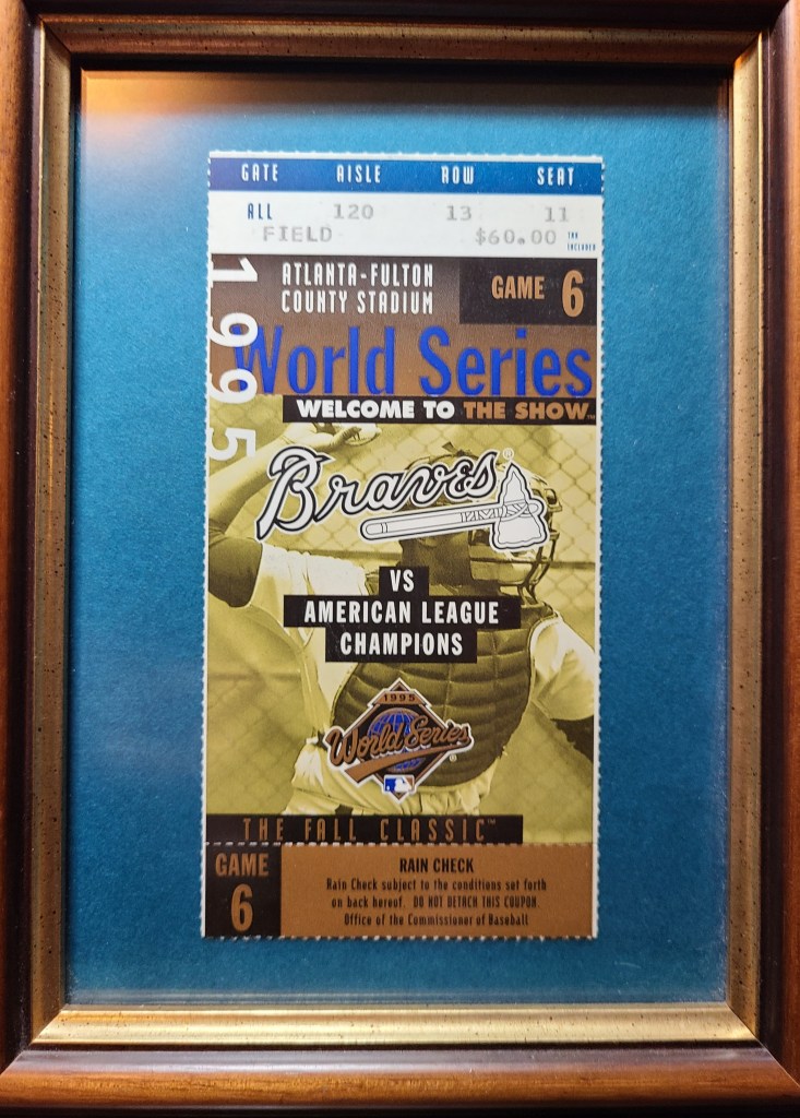 Twenty-six years ago I used this ticket to attend Game 6 of the World Series in Atlanta. That night in 1995 the Atlanta Braves won the World Series. It was such an exciting evening and one I still remember so well. My mom was a huge Braves fan and she had passed away the year before. I had a feeling all during that series as I watched that this was their year…and it was! And when the Braves won in that 6th game I felt like Mama was there in Atlanta with me. It was a wonderful feeling. And now, the Braves have done it again in six games. WooHoo! And what better year to win after the travesty of moving the All-Star Game out of Atlanta earlier this year….something that should have never happened. Go Braves! Your the best!!!!