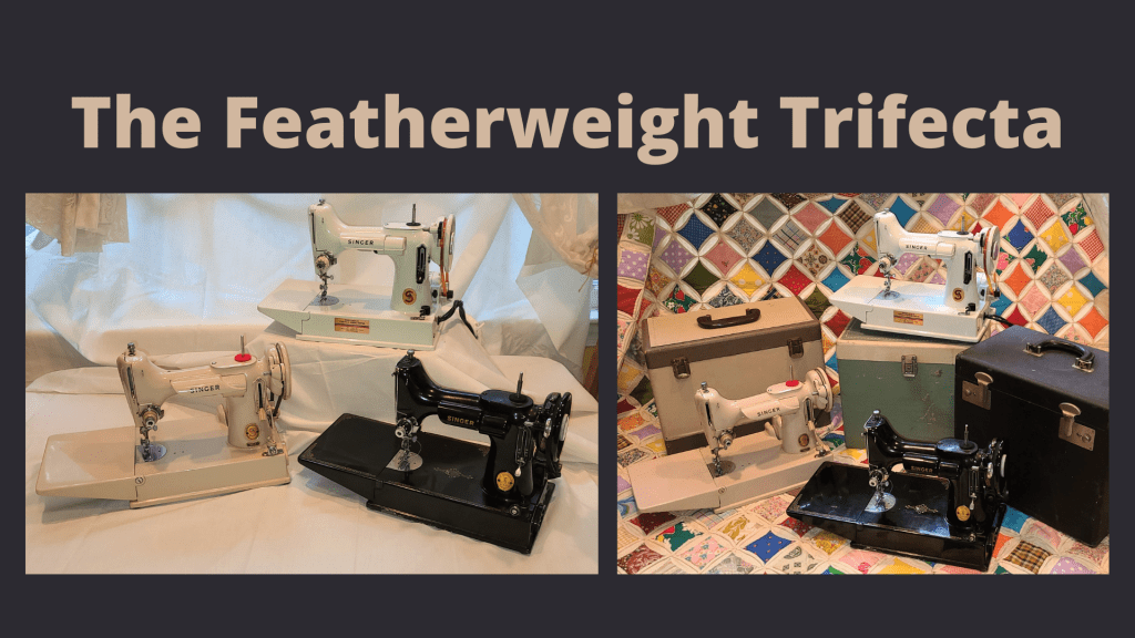 The Singer Featherweight is a model of domestic sewing machine made from 1933 to 1968. They are portable, with a flip up bed that allows them to fit into a neat little box. They are highly valued among quilter’s as they make an amazing stitch. They are also fairly quiet. Singer first made them in black. Then they added white and tan. Several years ago I acquired my first one at an auction. It is the black one made in 1946. Last year I added the white from 1964. And I search for quite some time to find a 1961 in tan. I recently got it. (They are shown in the photo here with and without their cases.) There is a tradition of naming Featherweights after women. I named the black one Nola Mae for my paternal grandmother, the white is Lucille for my maternal grandmother and the tan is Barbara Ann for my mom. These three women taught me to sew and to love crafting. I feel like I finally hit the TRIFECTA of Featherweights! I love these three little beauties.