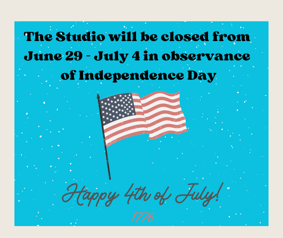 The Studio is closed today through next Tuesday in observance of Independence Day. We are taking a little time off to recharge and visit with family. We’ll be back on our regular schedule next Wednesday. In the meantime, have a great long Holiday weekend and remember the real reason we celebrate this day and read (or reread) the Declaration of Independence. You can see it here.