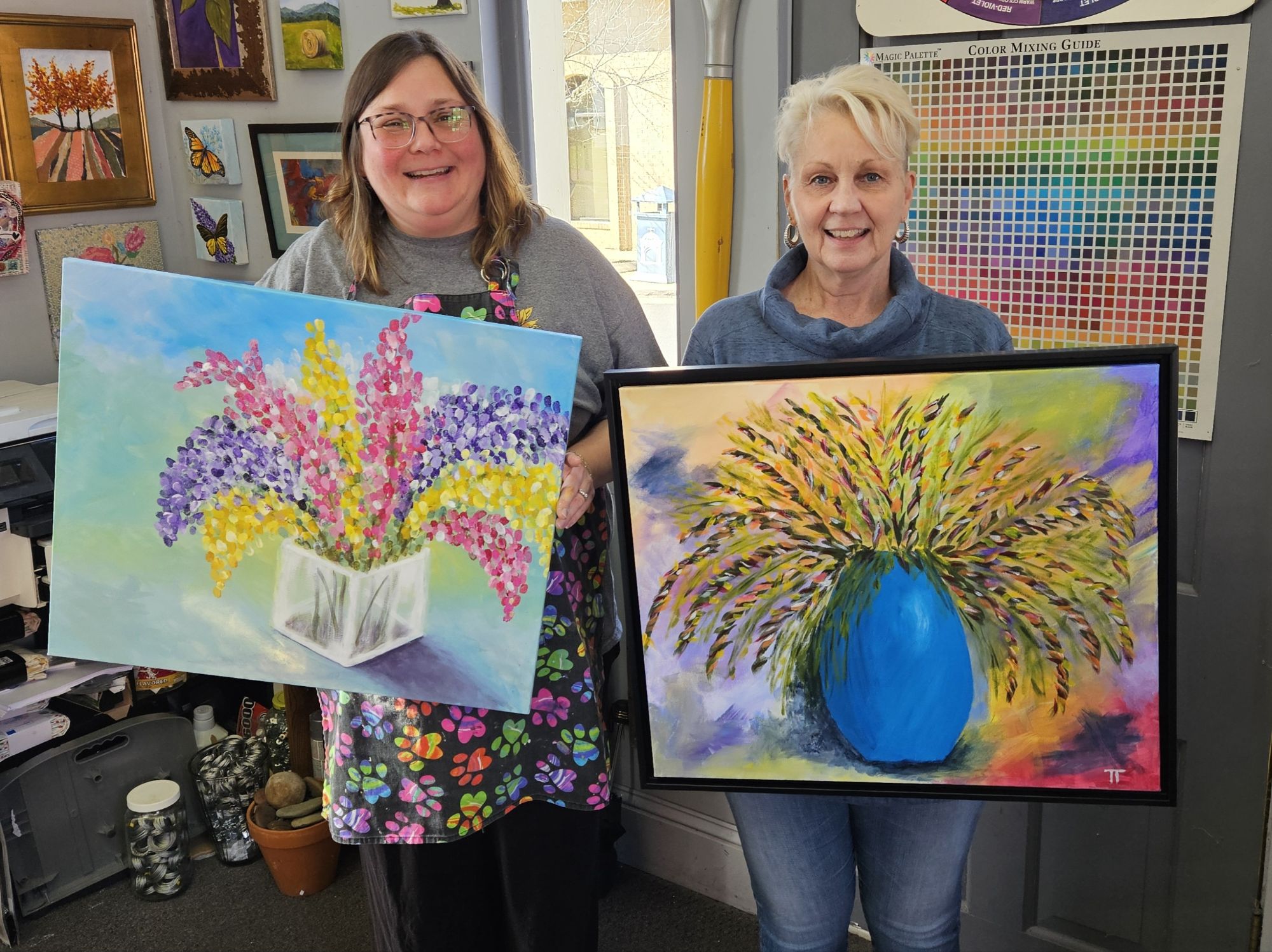 Carrie and Terri did beautiful work yesterday as they explored Abstract Florals with a little brushwork and a little finger painting. What fun!