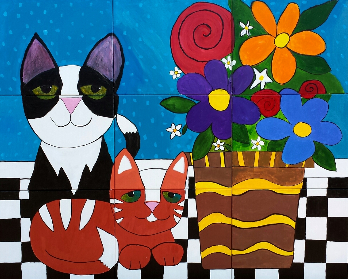 The Creative Team Building art went to its permanent home yesterday. We hung the work of art at the Humane Society of Warren County Shelter where it will reside as a permanent reminder to the participants of their team building experience as well as providing a bright and cheery focal point near the cat area. (Remember this is the wonderful creation of the Feline Staff of the Shelter. Read that here.)
