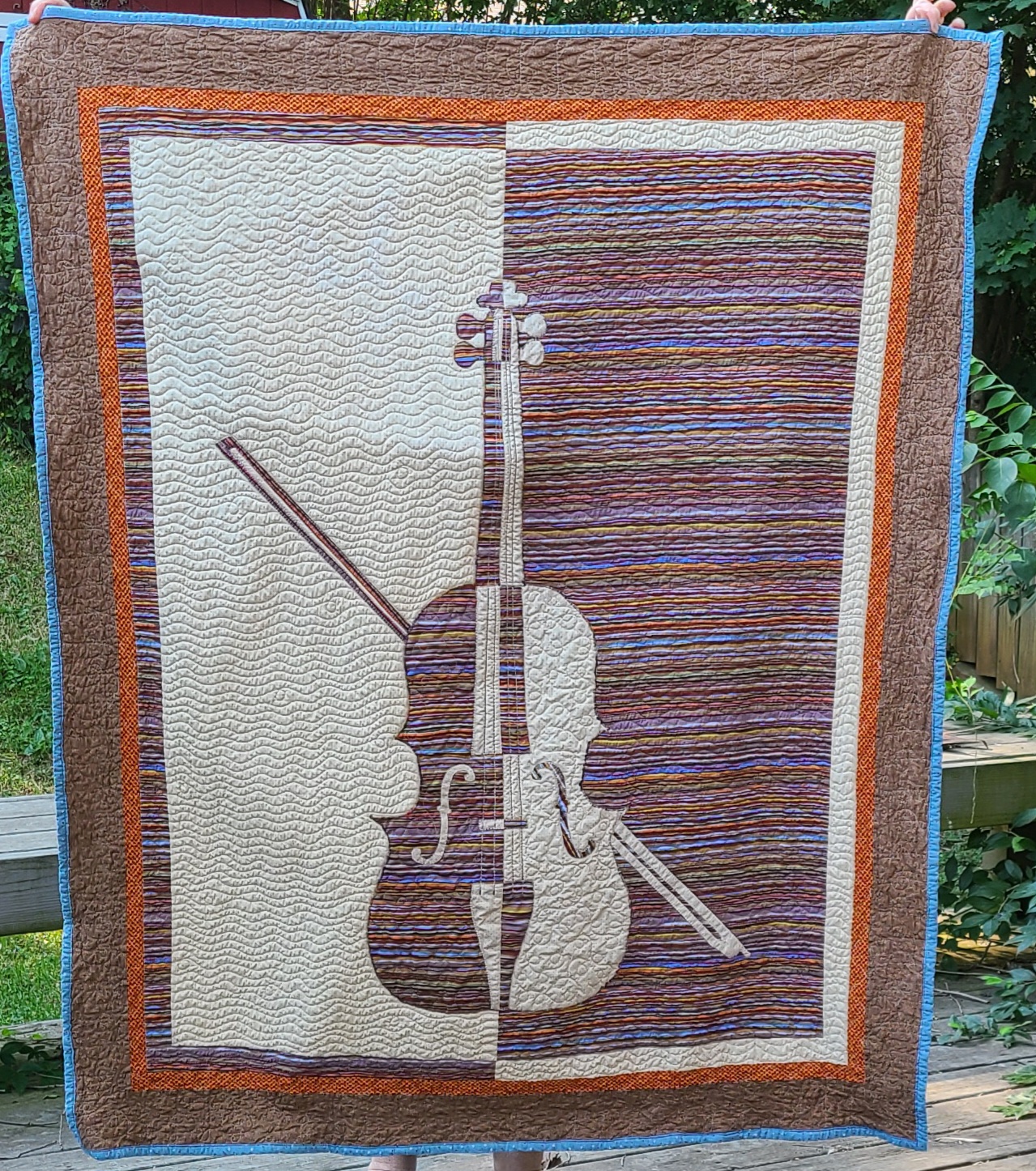 A few years ago Brother decided that he wanted to learn to play the fiddle. So he taught himself how! Now he goes to fiddle fests and Bluegrass jams and fiddles and fiddles. I wanted to make him a special quilt. I decided that a large fiddle applique playing with darks against lights would be best. I like how it turned out but once Wendy Hughes, long-arm quilter extraordinaire, performed her magic it turned into an incredible quilt. Thanks Wendy! I love it…and I just heard from Brother. I mailed it to him and he got it today. He loved it too! 🙂