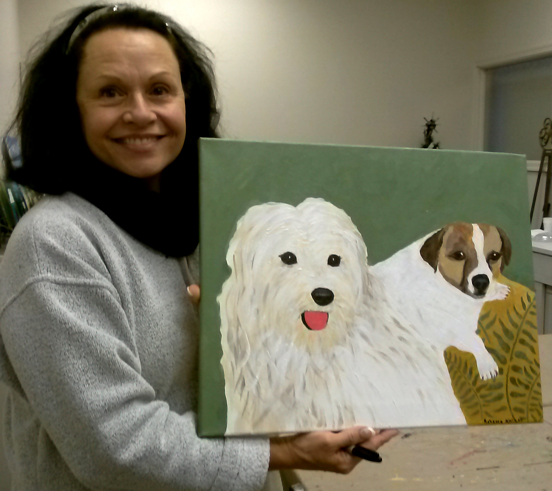 And Rebecca, who started her painting at the “Paint Your Pet Portrait” Party a few weeks ago, came in and finished her painting of her wonderful pups. Super! So glad you painted these sweeties.