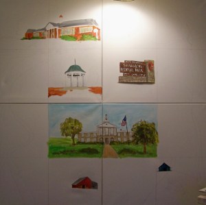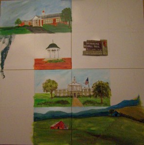 As if the “Bark for the Park” series wasn’t a big enough project for this year, I have started another one. I am teaching an art residency at the five elementary schools here in Warren County. We will be painting a piece to depict the 175th Anniversary of Warren County. I’ve had to do quite a bit of research in order to tie the project into the History SOL’s for 4th grade as well as come up with interesting pictures for the kids to paint. Over the next few days I will show the progress of the sample painting that I did. Then, hopefully, I will be able to share the paintings that the kids finish.