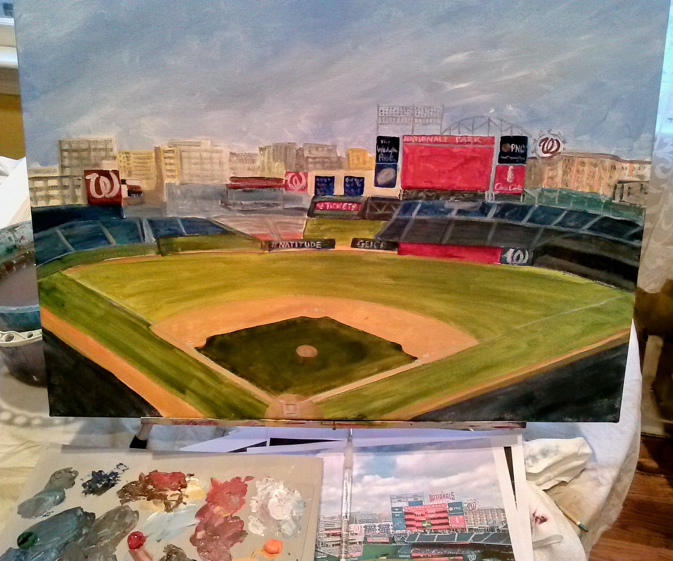 Here are five of the “Painted Diamonds” ball park paintings that were recently being varnished and prepared for framing. (You can see that Mamie was helping me!) Once the paintings are completed I give them some time to dry thoroughly and then I went back over them, touching up any areas that I felt needed a little more work, signed them, varnished them, and put them in frames. This all in preparation for the exhibit that will be held from October 23 – November 8 at the Blue Ridge Arts Council. The Opening Reception will be Wednesday, October 23rd from 6 – 8 pm. Please mark your calendar and plan to attend. It will be a fun evening with a baseball theme (of course). I’ll post more about it as the plans are finalized.