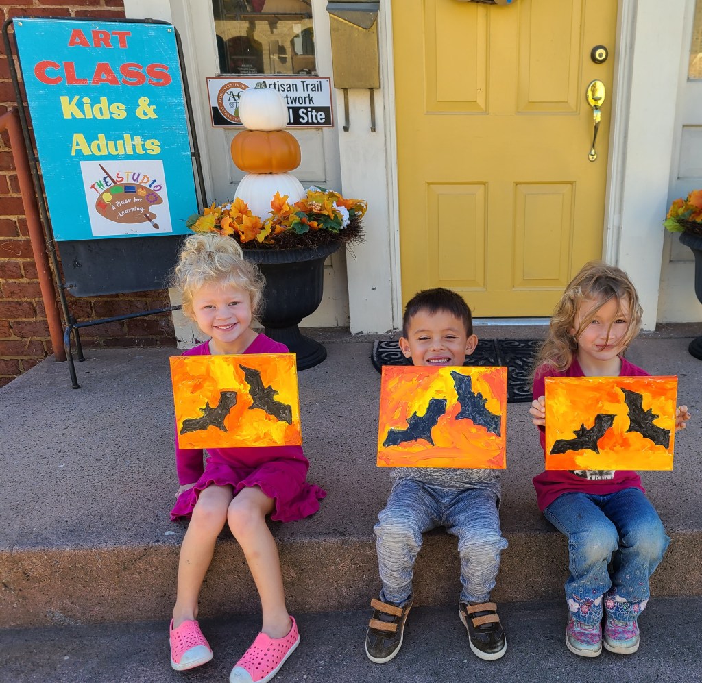 We’re preparing for Halloween as the Homeschool Kids painted spooky bats at class yesterday. Great job by these young painters. If you have a young painter that would like to join us every 1st and 3rd Thursday at The Studio from 11 am-Noon just contact kwalker@kellywalkerstudios.com to register and for more info.