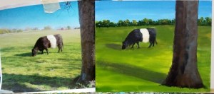 Here is my painting (right) along with the reference photo on the left. I swear these cows don’t even look real with their funny coloring!