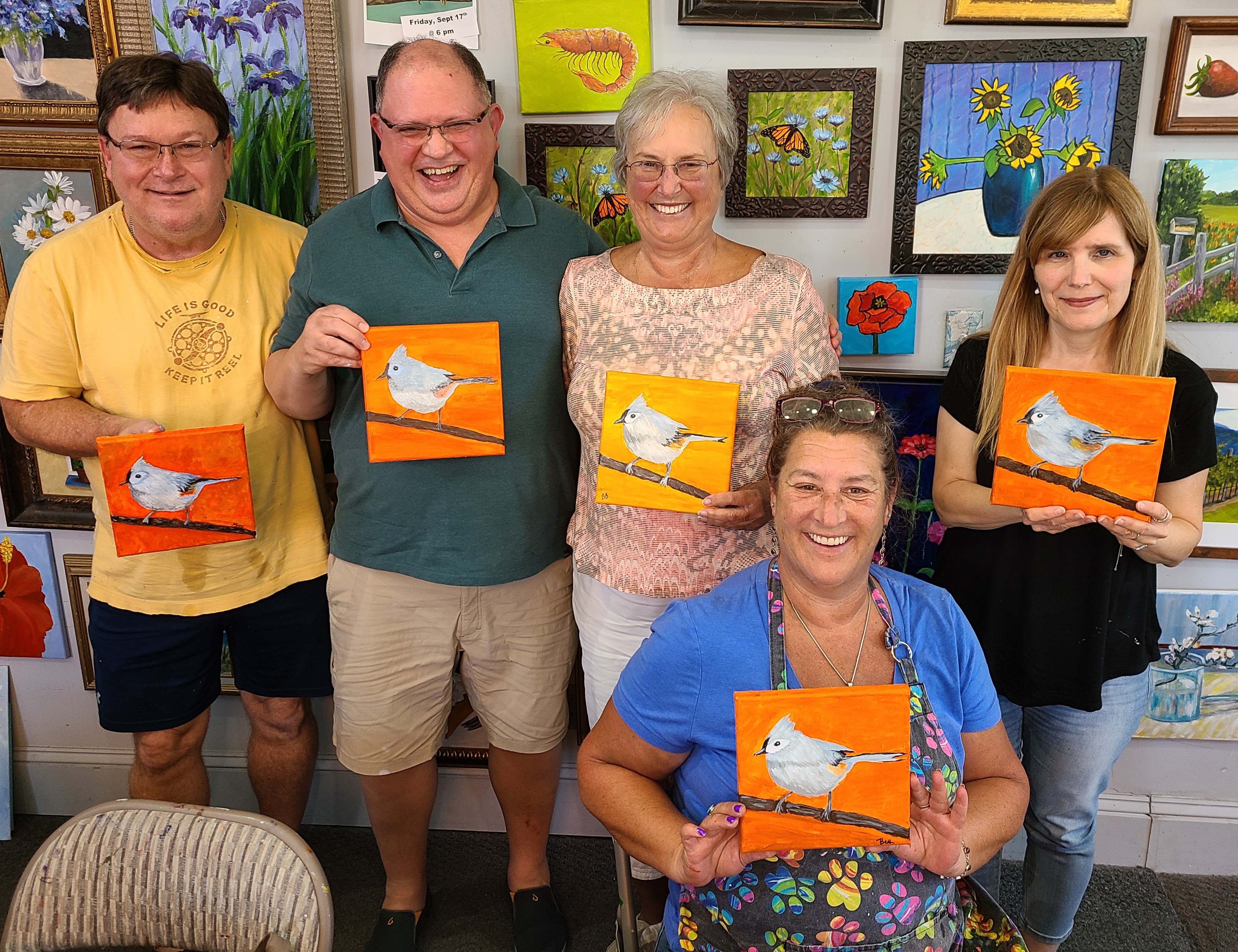 Last night we completed the 4th bird in our Bird Series of paintings – The Hummingbird. What a terrific bunch of painters. They all look so good. The next bird up is the Tufted Titmouse on Sunday, August 29th. Click here to see more and register. And if you have missed any of our little birds and want to paint one we will be having a make-up session on Tuesday, September 7th to paint any of the five birds we will have completed by then. Come do one of the one you missed on that date. Click here to register for make-up session.