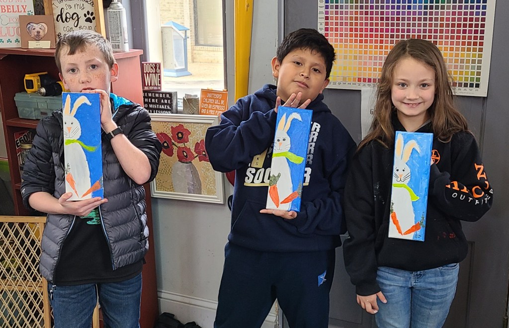 And we are always getting requests for something for really young painters to do so we have a “Kid & Me” party coming up on Saturday morning, March 17th at 10 am for kids ages 3-7 to paint with their adult. We’ll make this cute little door hanger just in time for Easter. Click here to register for that one.