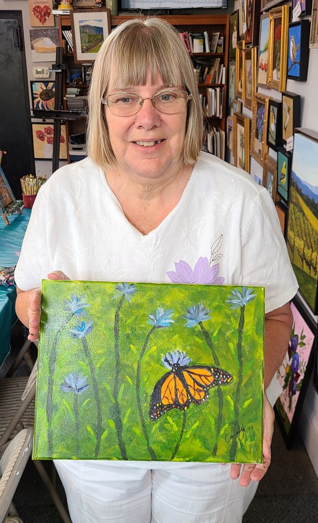 The Monarch, acrylic on canvas measuring 10″x20″, framed, $145. Click here to go to The Studio store to purchase or see what else is available. And thank you again for your continued support of my small business during this unusual and difficult time!