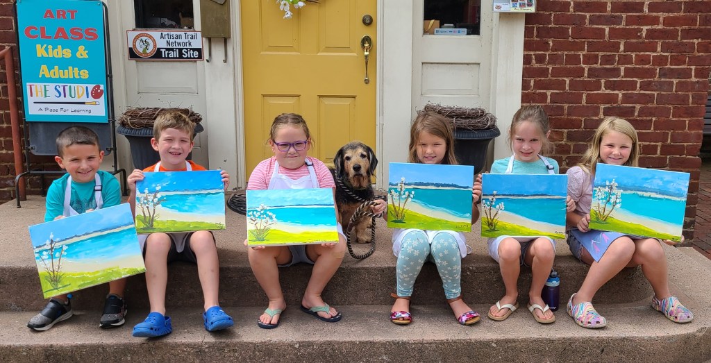 The kids painted a really nice night scene with a campsite….tent and campfire included. Class for kids is every Wednesday from 4:15-5:15 pm. Contact kwalker@thestudioforlearning.com to register your young painter.