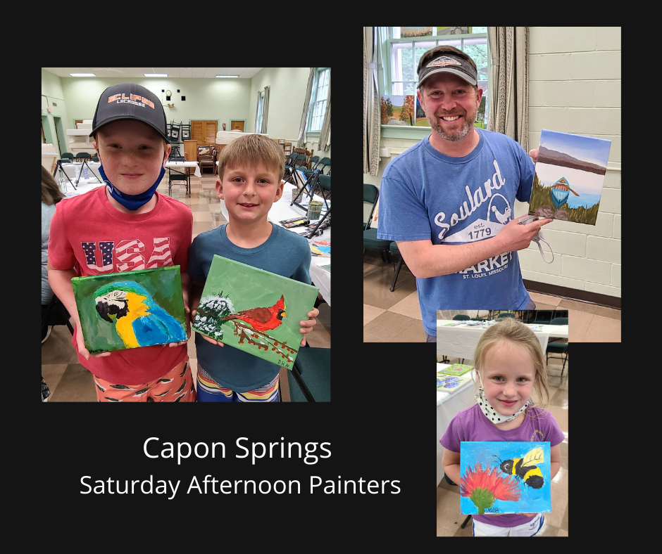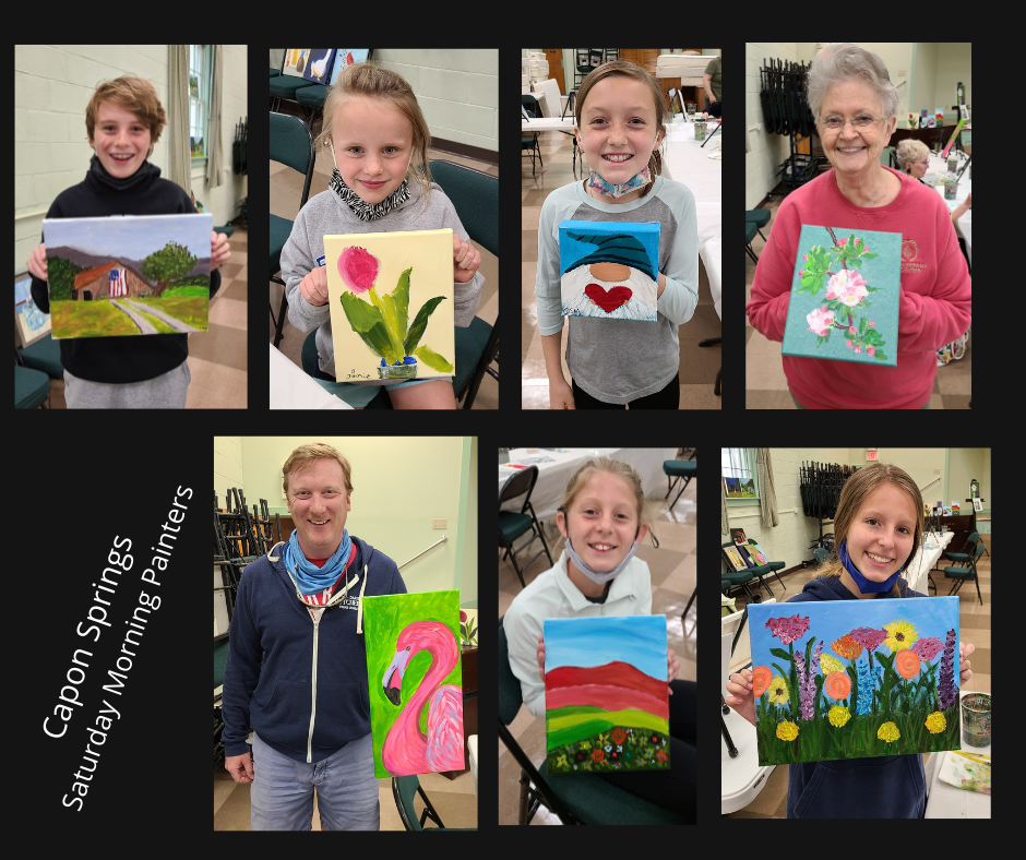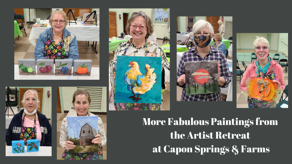 It’s so terrific to see families come in to paint together. We had one big family…some came from Philadelphia and others from Connecticut, to meet at Capon for a reunion. And while here they discovered their artistic side. They all did a fabulous job on their paintings. Nice work everyone!