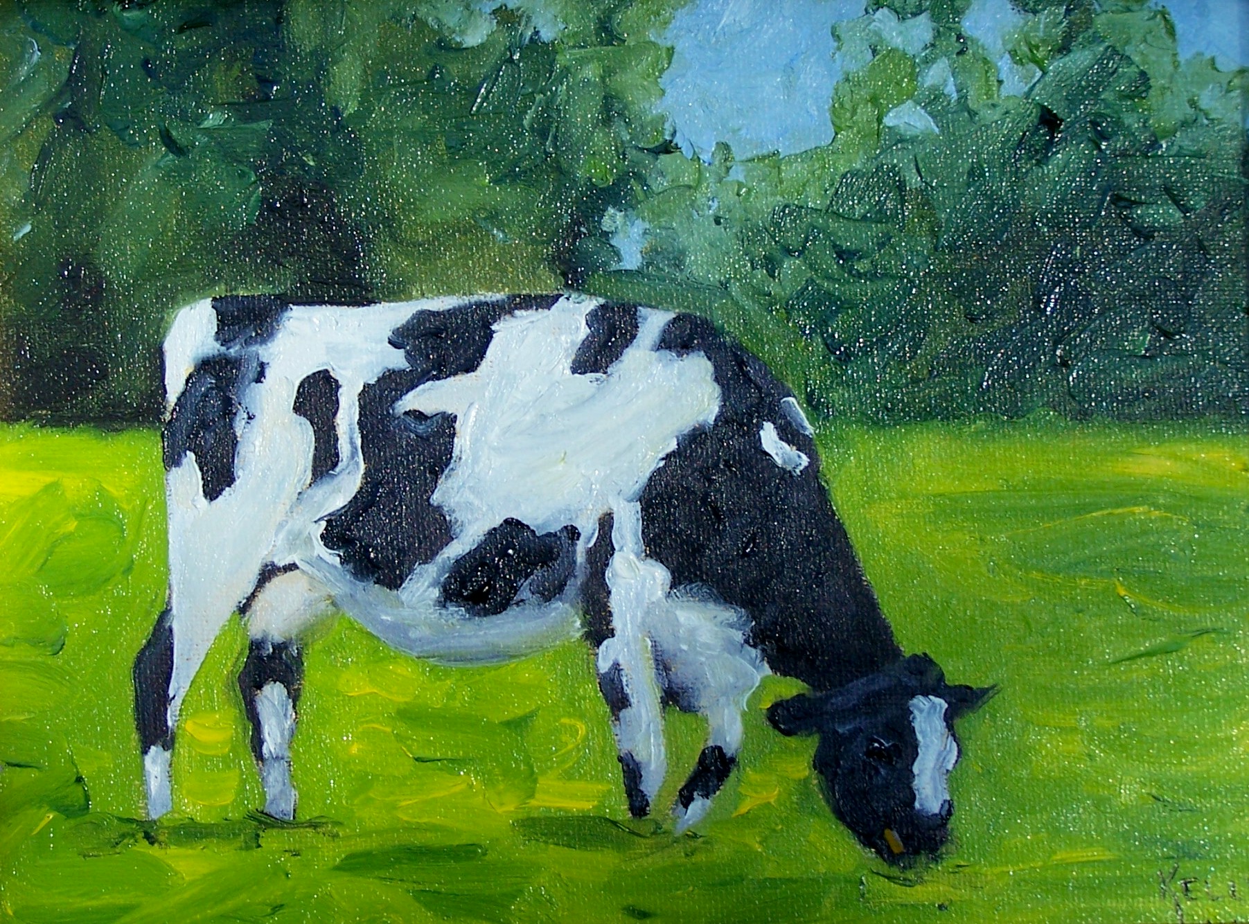 Grazing Cow is an oil on canvas panel measuring 6″x8″ and is available for $125.