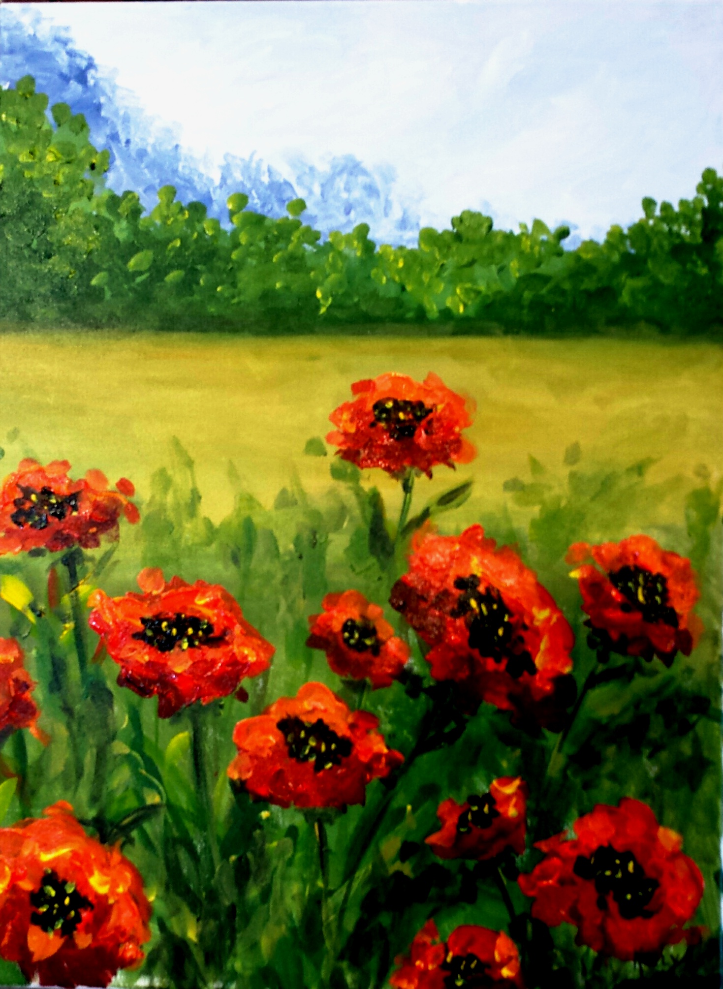 Bright Poppies, acrylic on canvas, 18″x24″, available by contacting kwalker@doubledogdesigns.com