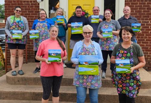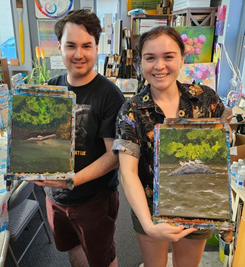 We love it when visitors from out of town schedule time to paint while they are visiting the area. I got a message this week requesting space in Wednesday evenings adult art class. Katie and Jake were visiting….on their honeymoon! They had kayaked on Wednesday morning and took photos, including the two that they used of a turtle on a log and 4 ducks in a row on a rock that they painted Wednesday evening. What a great rememberence of their time in our beautiful area. Congratulations again and enjoy your art!