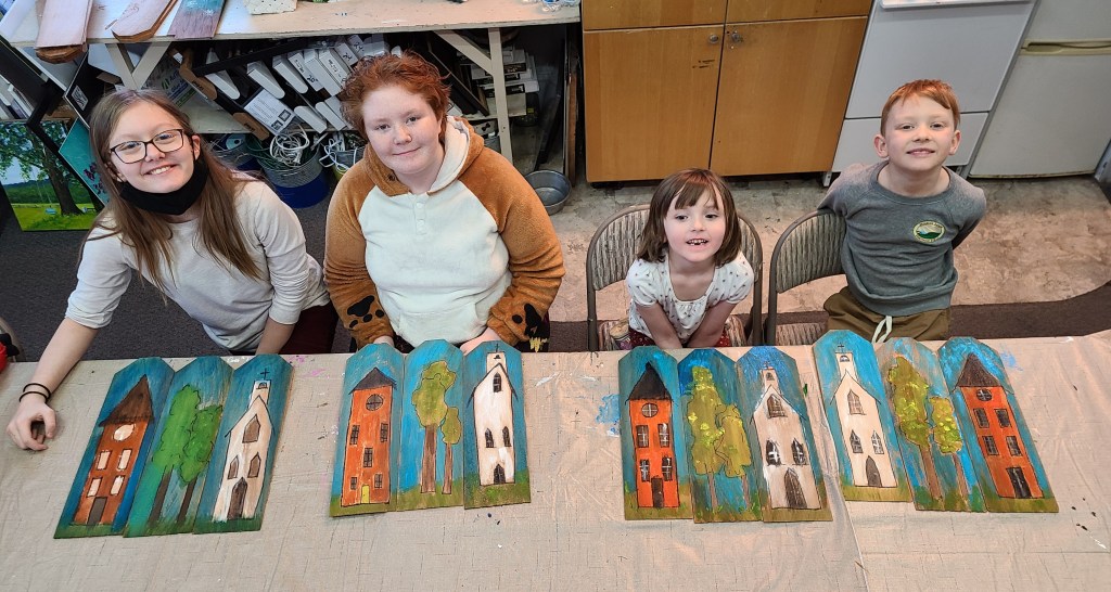 At The Studio Kid’s classes we explore different types of arts as well as different mediums and supports. This week the kids in Wednesday’s class painted these folk art scenes on old wooden shingles. It was fun and they look great!