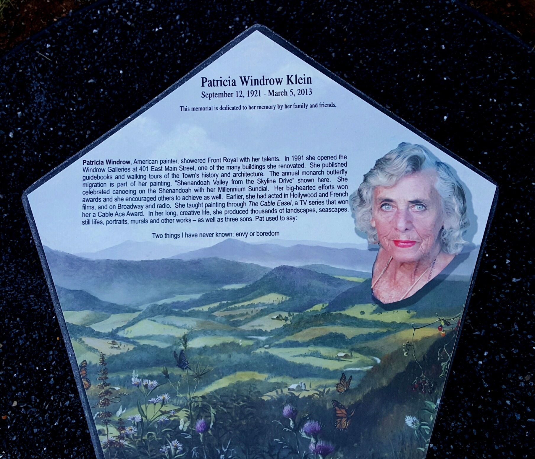 The family and friends of Pat Windrow honored her this past weekend by unveiling a memorial at the Town Commons in Front Royal. Pat was an artistic force of nature in Front Royal. She painted amazing murals on several buildings around town – both inside and out. Since her passing we are all hoping that these will be maintained by the owners of the buildings. They are irreplaceable.