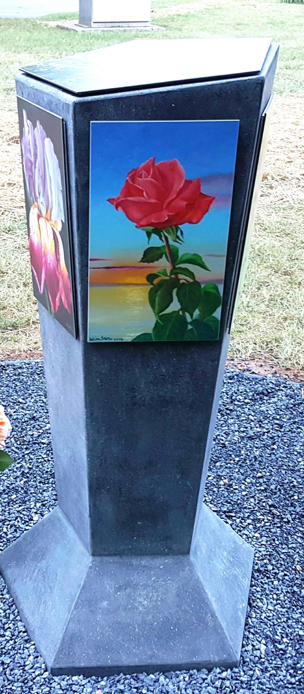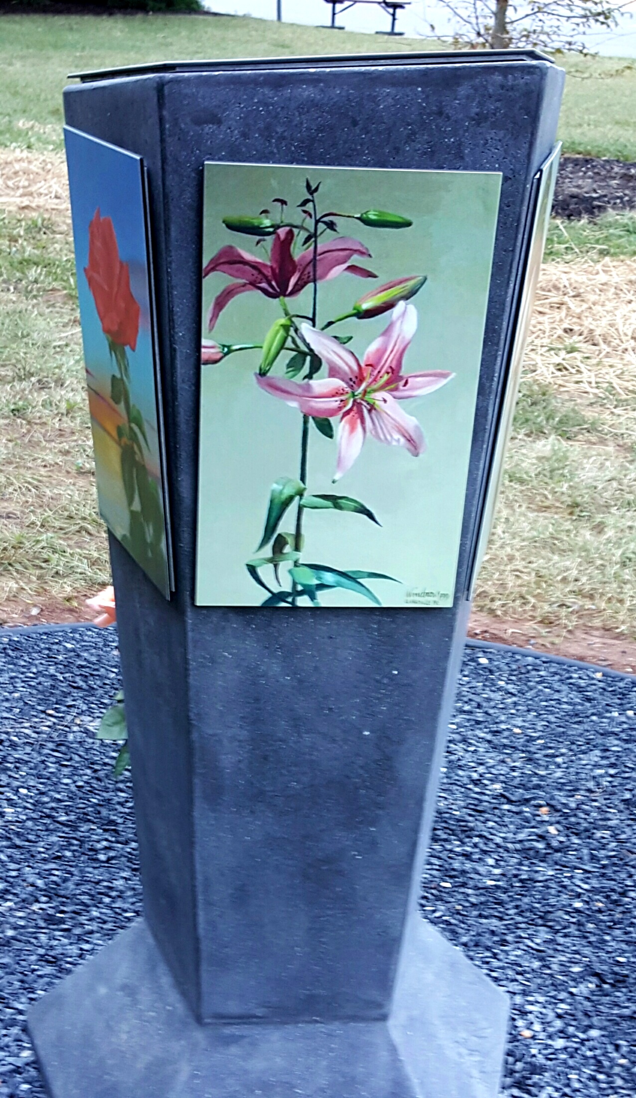 The memorial that was dedicated features wonderful images of some of Pat’s beautiful floral paintings. It’s a fitting way to honor this creative woman.