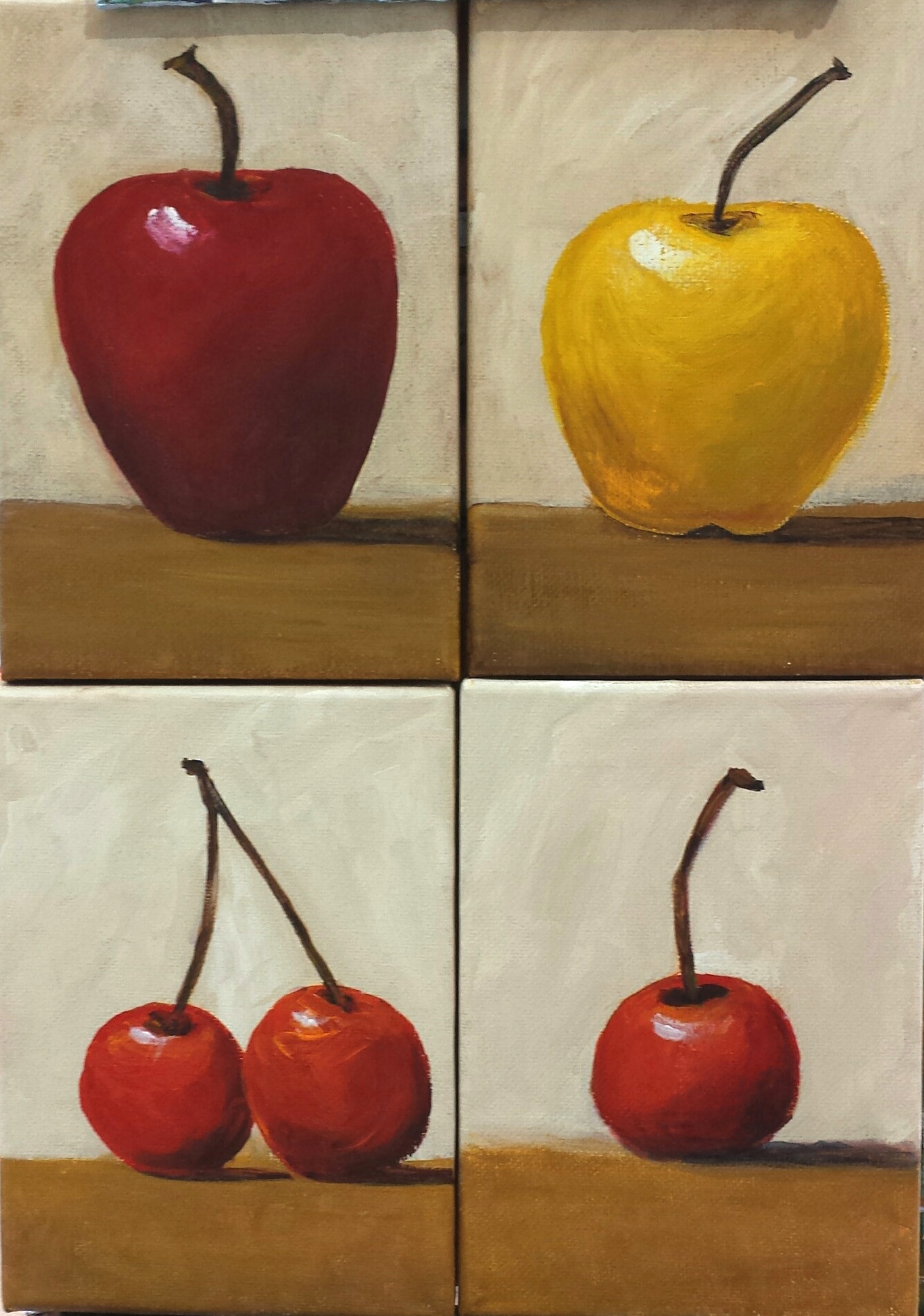 Now here they are almost finished along with the two apple paintings. Each is 5″x7″, acrylic on canvas. Now I need to work on the two pear and two grape paintings. Then I will put the final touches on all of them. Look for them soon!