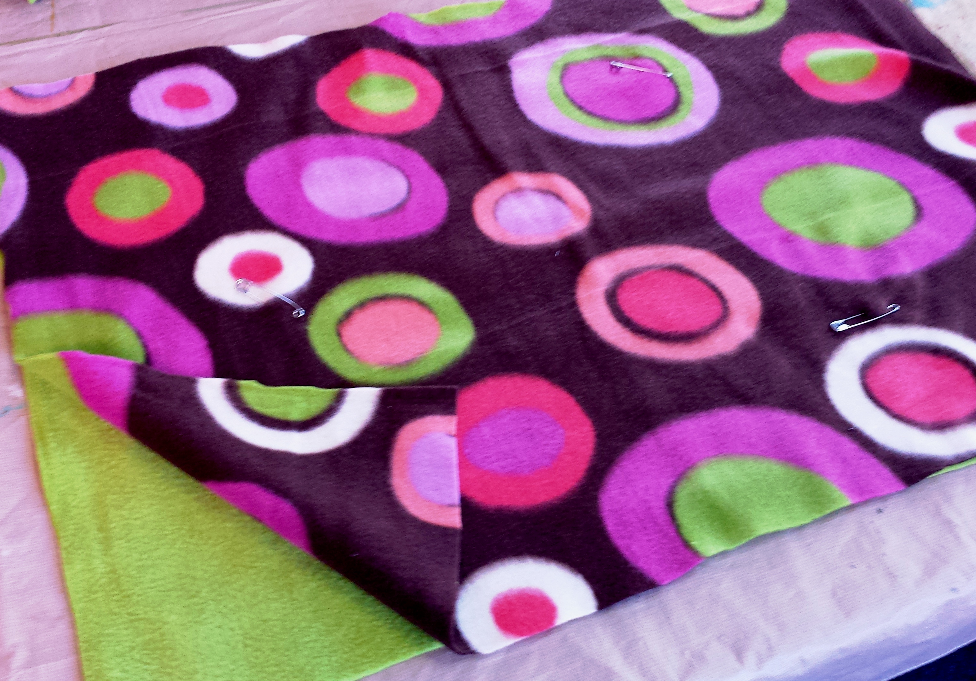 1. Decide the size you would like for your blanket and purchase two pieces of fleece to accommodate the size. Place the two pieces of fleece wrong sides together and cut them to size.