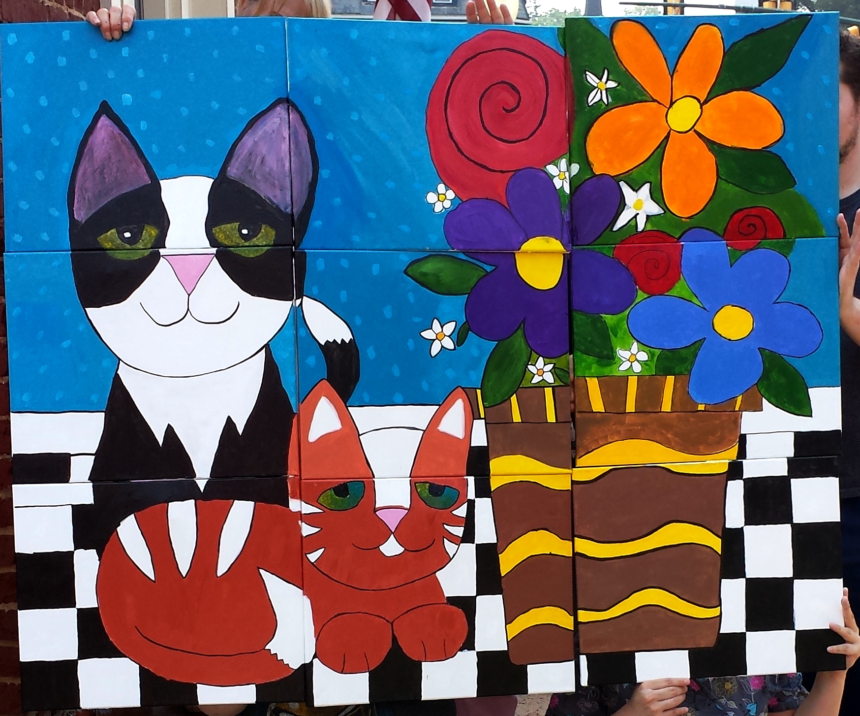 The Creative Team Building art went to its permanent home yesterday. We hung the work of art at the Humane Society of Warren County Shelter where it will reside as a permanent reminder to the participants of their team building experience as well as providing a bright and cheery focal point near the cat area. (Remember this is the wonderful creation of the Feline Staff of the Shelter. Read that here.)
