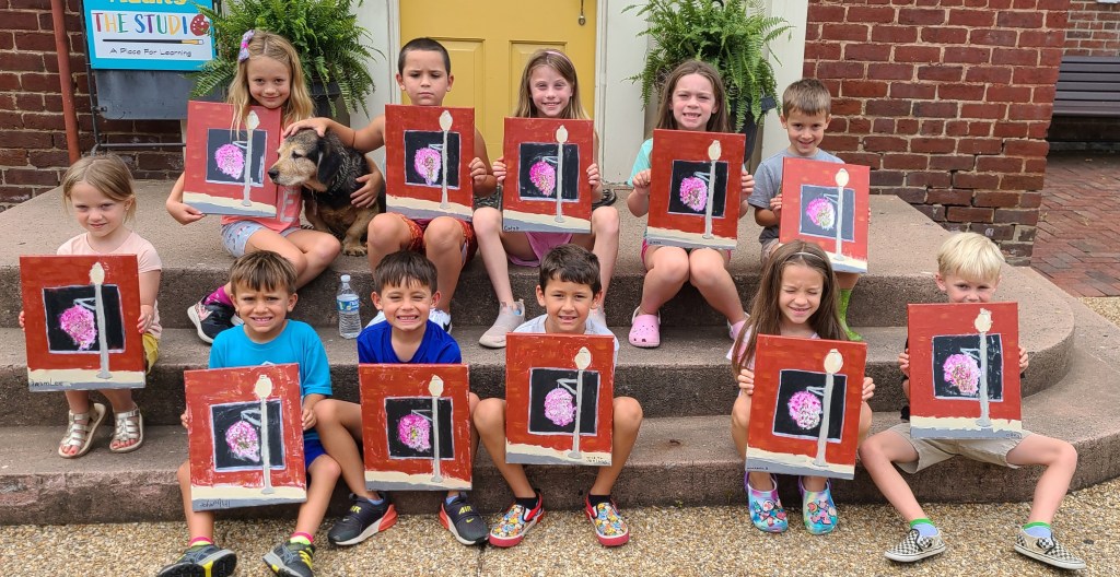 We started our last week of Art Camp with “Paint the Valley” week. Our young painters created a beautiful canvas of the hanging baskets on Main Street. Aren’t they GREAT???!!! Wait until you see what they do today.