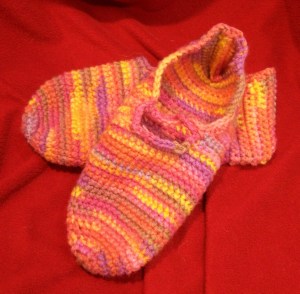 There are also these beautiful variegated girly color slippers that I had to make. I just love this yarn. It works up so pretty.
