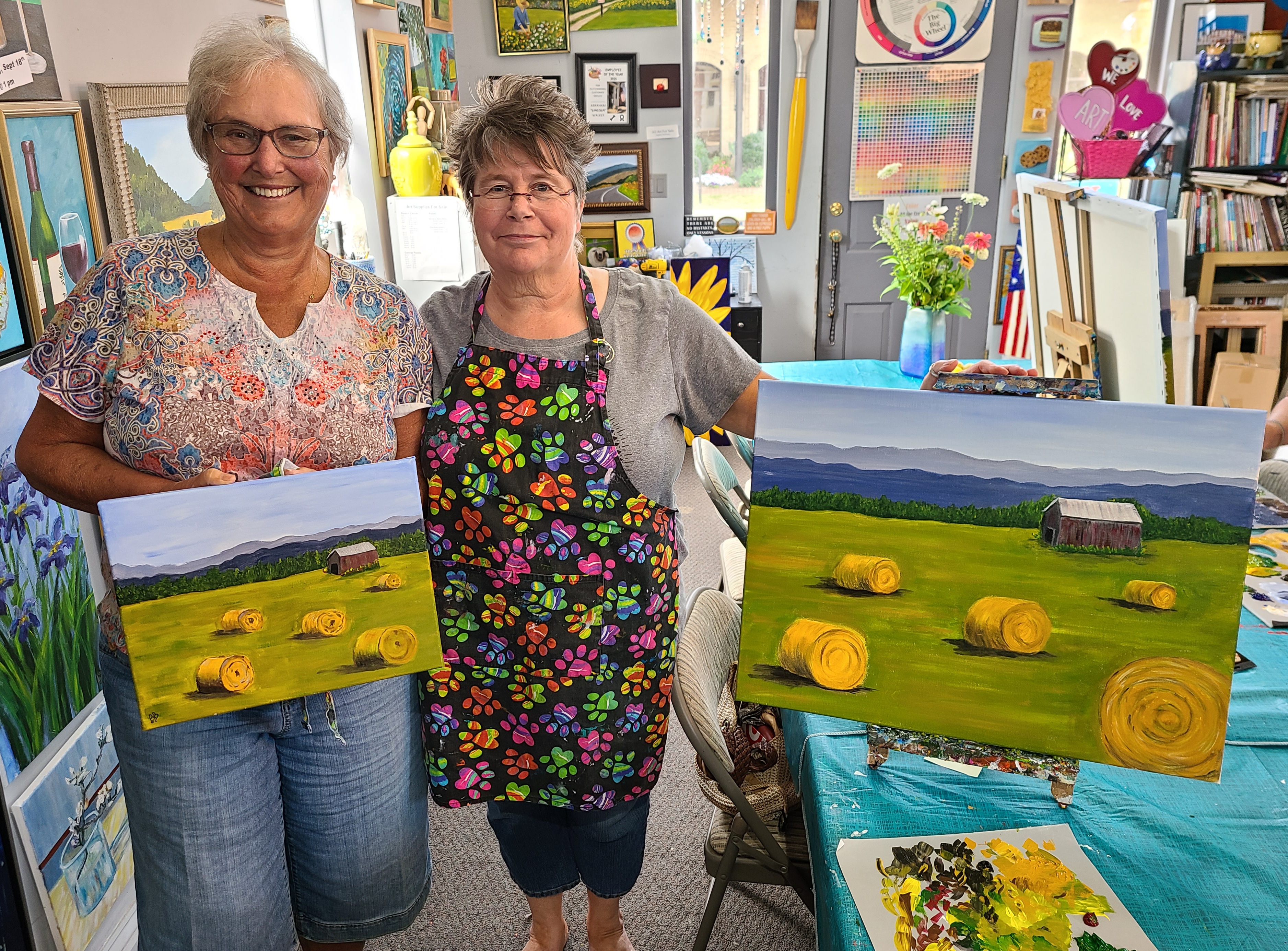 10612786_10203050172310343_3730363694214175106_nThe group at the 1st Saturday Paint Party created wonderful paintings of Hay Bales in the Field yesterday.  Great work ladies.  And what fun.  It is always good to paint with such a cheerful group.  Keep up the good work.