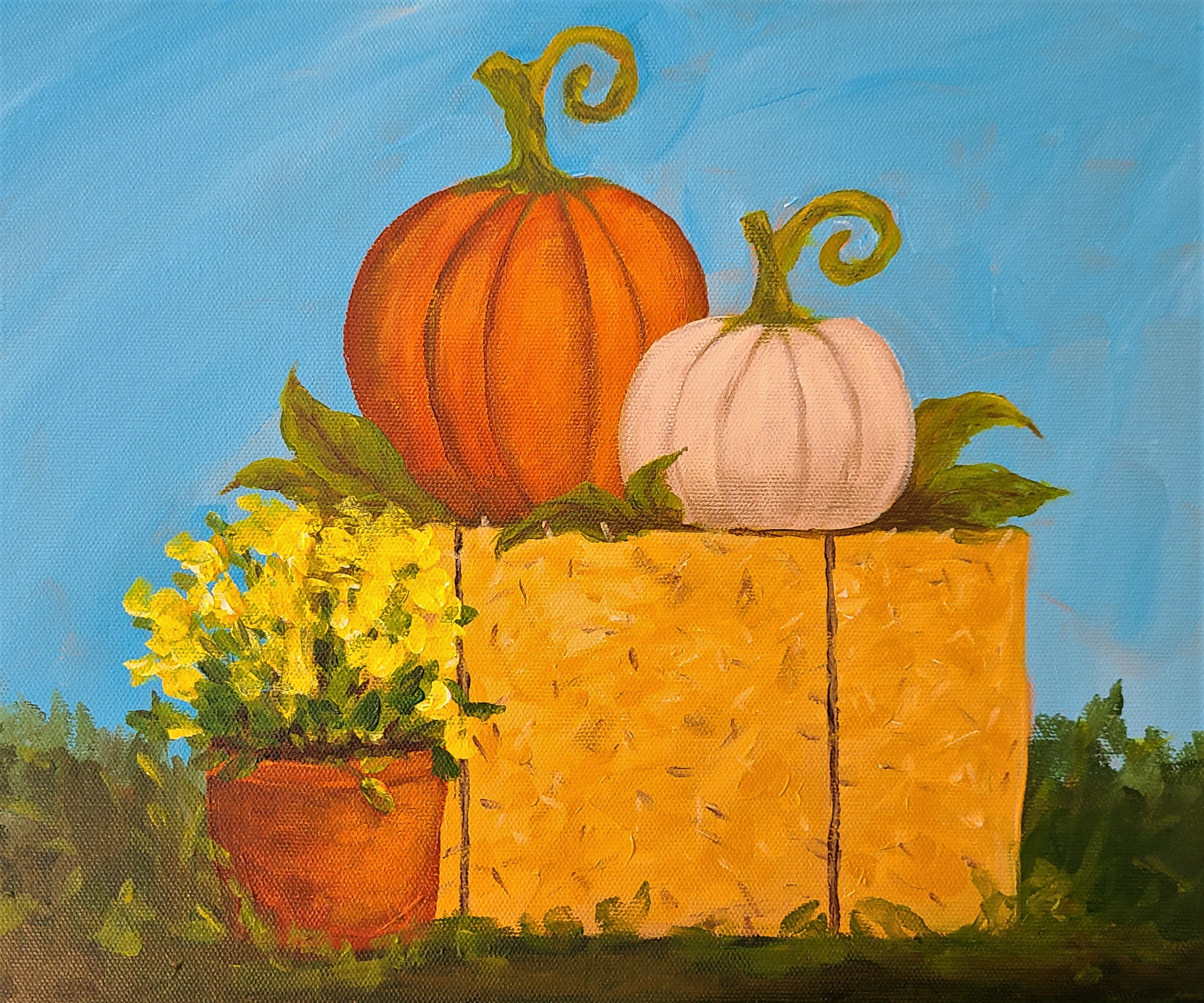 It’s almost fall. Time for some pumpkin paintings….and more! Pumpkins, hay bales, mums…..