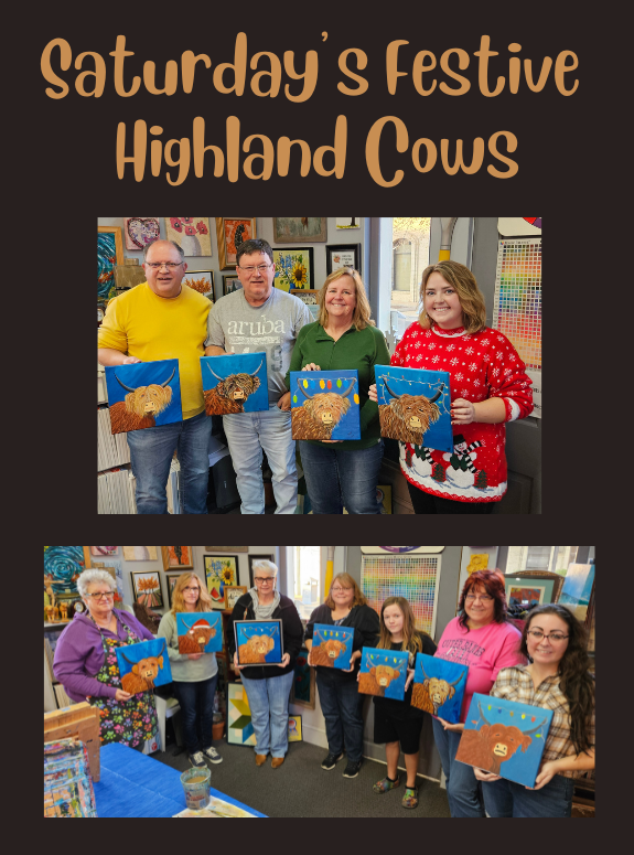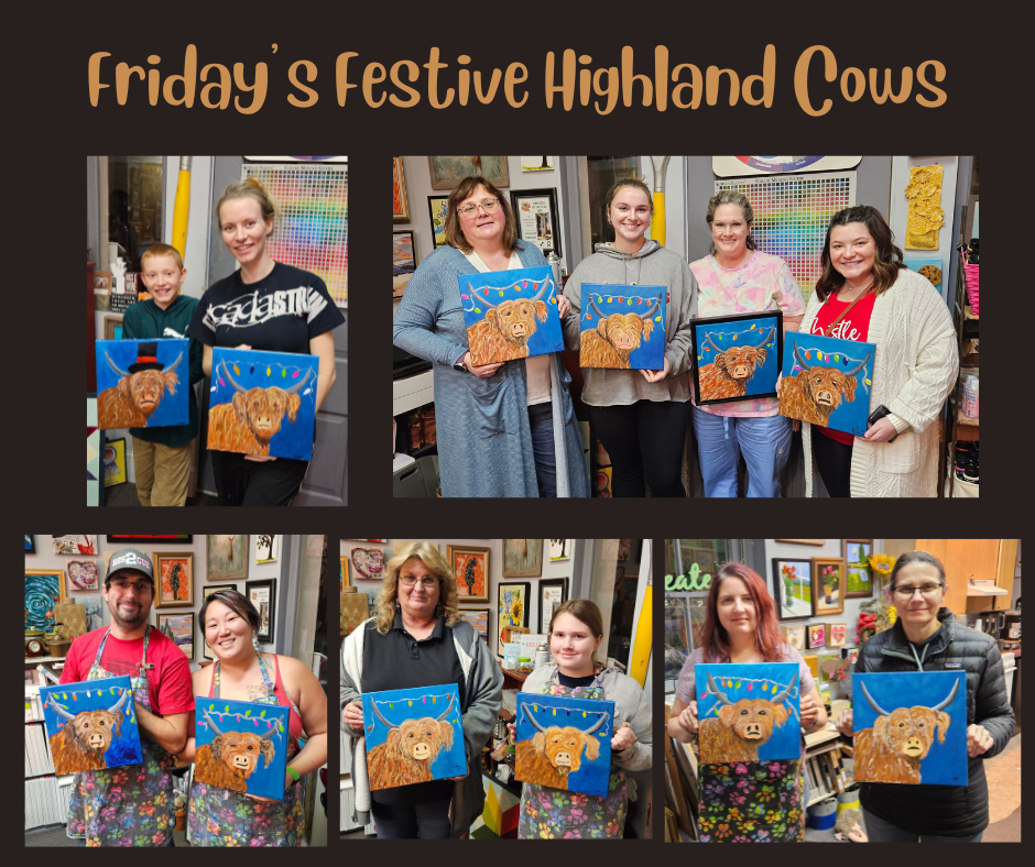 Yesterday we had a private party with family and friends painting the highland cow. Everyone did an awesome job and they all chose different embellishments from Christmas lights to Santa hats to mistletoe to wreaths to a daily in it’s hair. So much creativity! Great job everyone. Merry Christmas!
