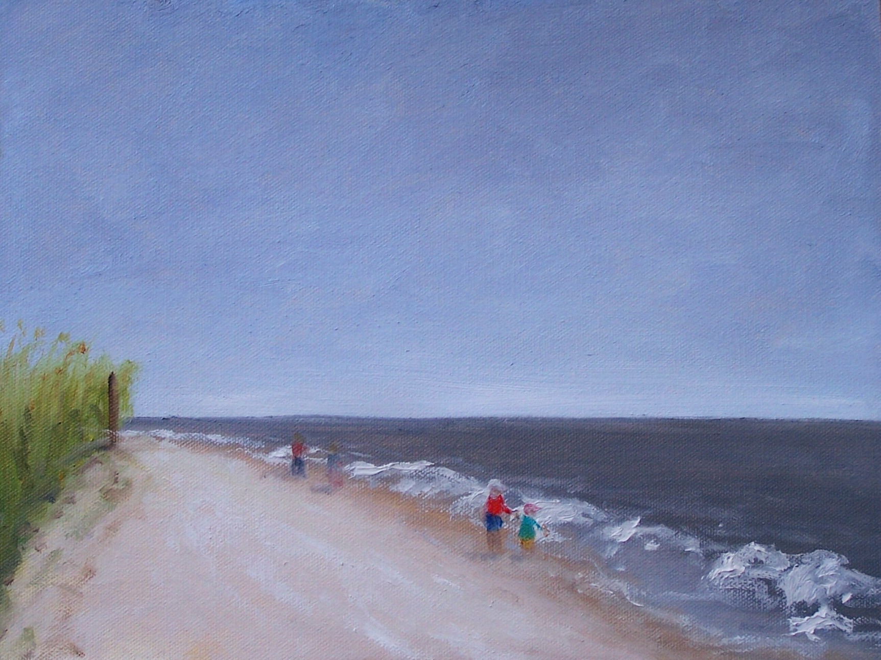 This was a fun painting because I spent most of the time watching a grandfather and his grandchildren playing in the water. The kids were young and really giving Grandpa a workout. I’ll bet he will be glad when their vacation ends. 🙂