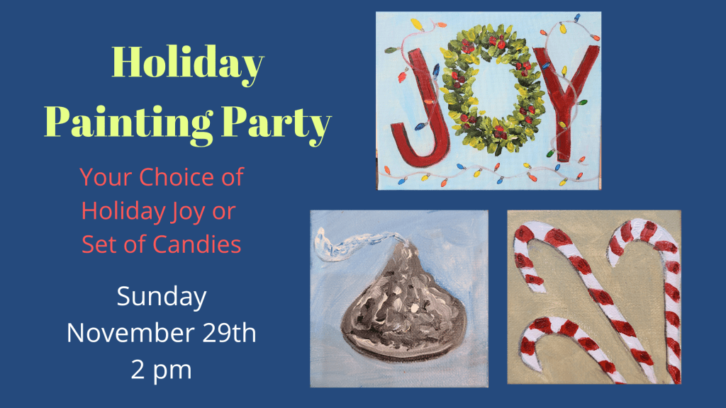 Join in the fun Holiday Painting Party on Sunday, November 29th at 2 pm. You choose to paint Holiday JOY or a set of Candies in a variety of sizes. Everyone is welcome. Register now and join us by clicking this link.