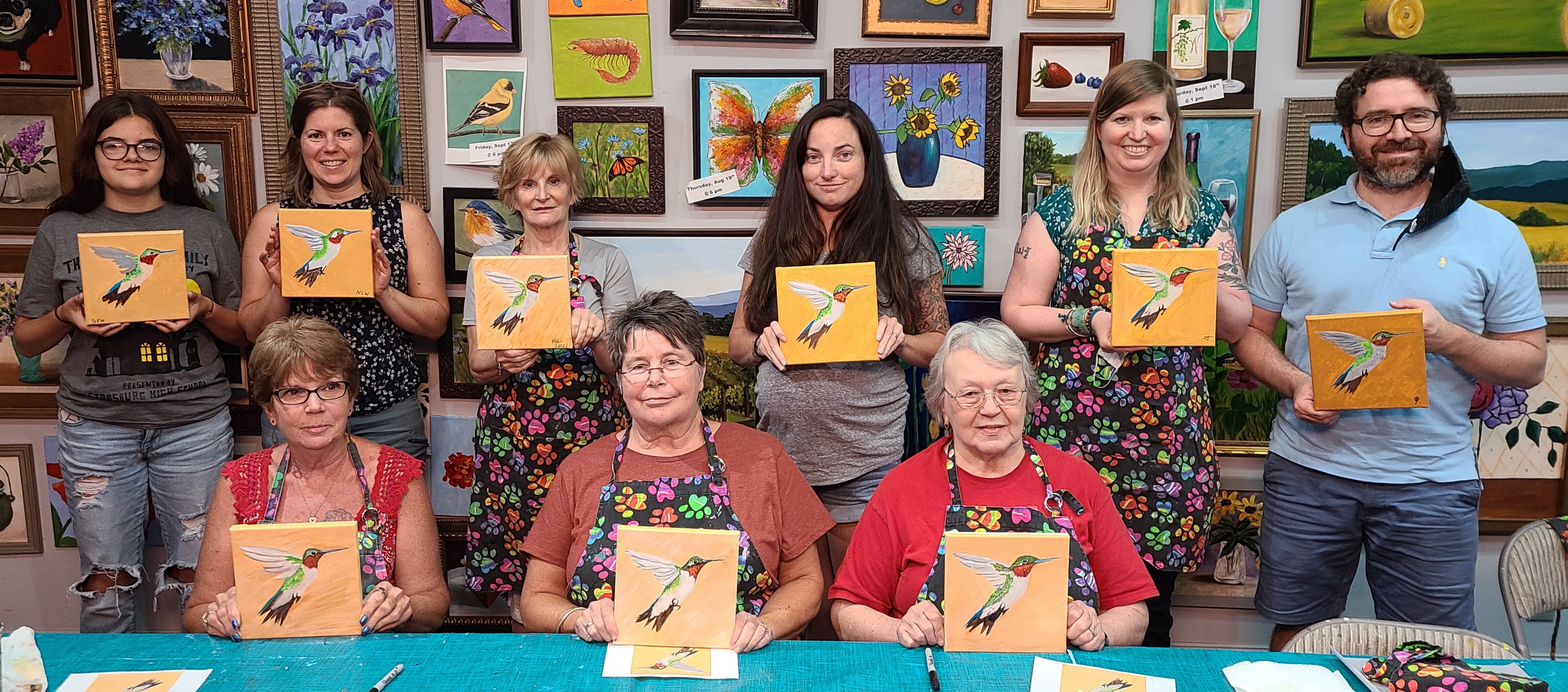 Last night we completed the 4th bird in our Bird Series of paintings – The Hummingbird. What a terrific bunch of painters. They all look so good. The next bird up is the Tufted Titmouse on Sunday, August 29th. Click here to see more and register. And if you have missed any of our little birds and want to paint one we will be having a make-up session on Tuesday, September 7th to paint any of the five birds we will have completed by then. Come do one of the one you missed on that date. Click here to register for make-up session.