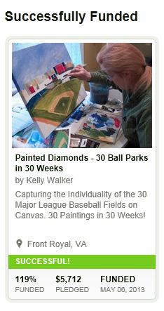 Kickstarter is a way for creative people to get projects funded. You go to the site and read about a project then click on the green button and make a pledge at the level you wish to help. As you read about the project you see that you get rewards for different levels of pledges. So choose your reward and make a pledge. You can help by pledging as little as $1 and every bit adds up to get to the goal of 100%. I must get to 100% for the project to work. Anything less than that and the pledges will NOT be collected. So I’m asking you PLEASE make a pledge today. Help me with this project. As far as we can find no one has ever painted all 30 Baseball Parks and certainly not in 30 weeks. Help make me the first. Thanks so much for your consideration and I’d appreciate it if you share this with your friends by clicking the Facebook or other share buttons below this post. Thanks again.
