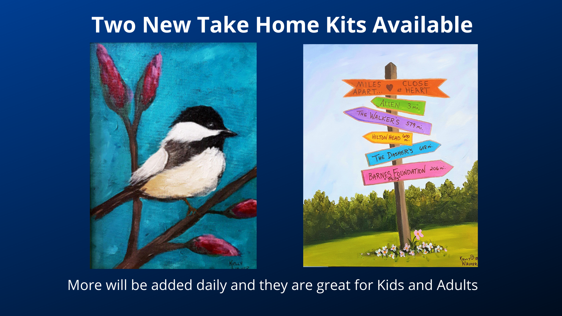 We have added two more Take-Home Kits from The Studio. These two are available with sketched canvas and written instructions. (No video on these two.) These are great images that anyone can do. Just follow along the directions and it will guide you to an amazing painting. Order today. Click here to see all the kits available for pick-up at The Studio or to be shipped to your home. Thanks!