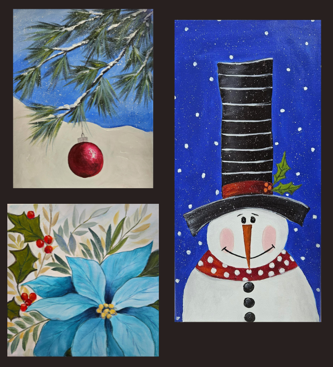 We just have three more Paint Parties this year scheduled at The Studio for you to come and join in and paint with us. Friday, December 15th at 6 pm paint the Ornament on the Pine Branch. Or join us on Saturday, December 16th at 1 pm to paint The Poinsettia….and you can choose to paint it red if you prefer. And our final painting this year is this dapper little snowman that features a “Lincoln” hat. We’ll paint this Adorable Snowman on the first day of Winter, Thursday, December 21st at 6 pm. This is a perfect way to spend holiday time with family and friends. Invite them to join you. Click the links for more information and to register. Happy Holidays!!!