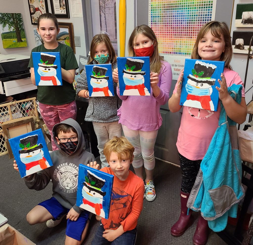 The kids got a kick out of painting a little snowman yesterday at class…especially when they put his mask on. Super cute! Nice paintings by everyone.