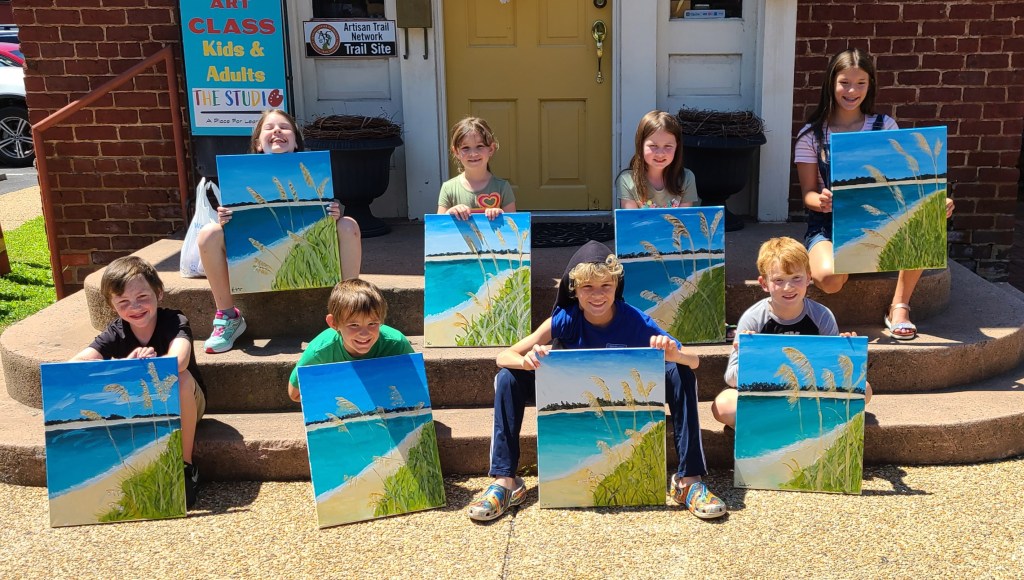 Just look at these young painters!!!! Aren’t they great???!!!! Our final painting for Art Camp 1 was a BIG beach landscape. They all did painted beautiful scenes. Nice! If you have a young painter don’t let them miss this opportunity to paint and learn this summer. Click here to register.
