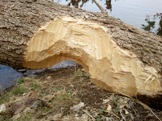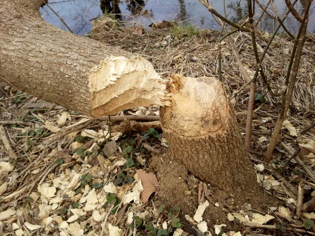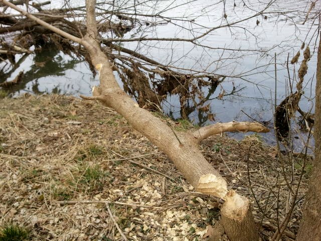 Over the past few months while walking the dogs down the path at Eastham Park to get to the dog park we have noticed several trees along the river that were down. A month or so ago while Allen was walking with me he said it looked like a beaver had been working. So yesterday I took a couple of photos of their handiwork. Beavers are the second largest rodent in the world but they sure look a lot cuter than rats! They build lodges and apparently that is what they are doing at the river. Beavers are herbivores preferring the wood of cottonwood, alder, birch, maple, and also pondweed and waterlilies. There used to be many more beavers but having been trapped for their fur numbers are down from a high of some 60 million to around 12 million. (More on beavers here.)