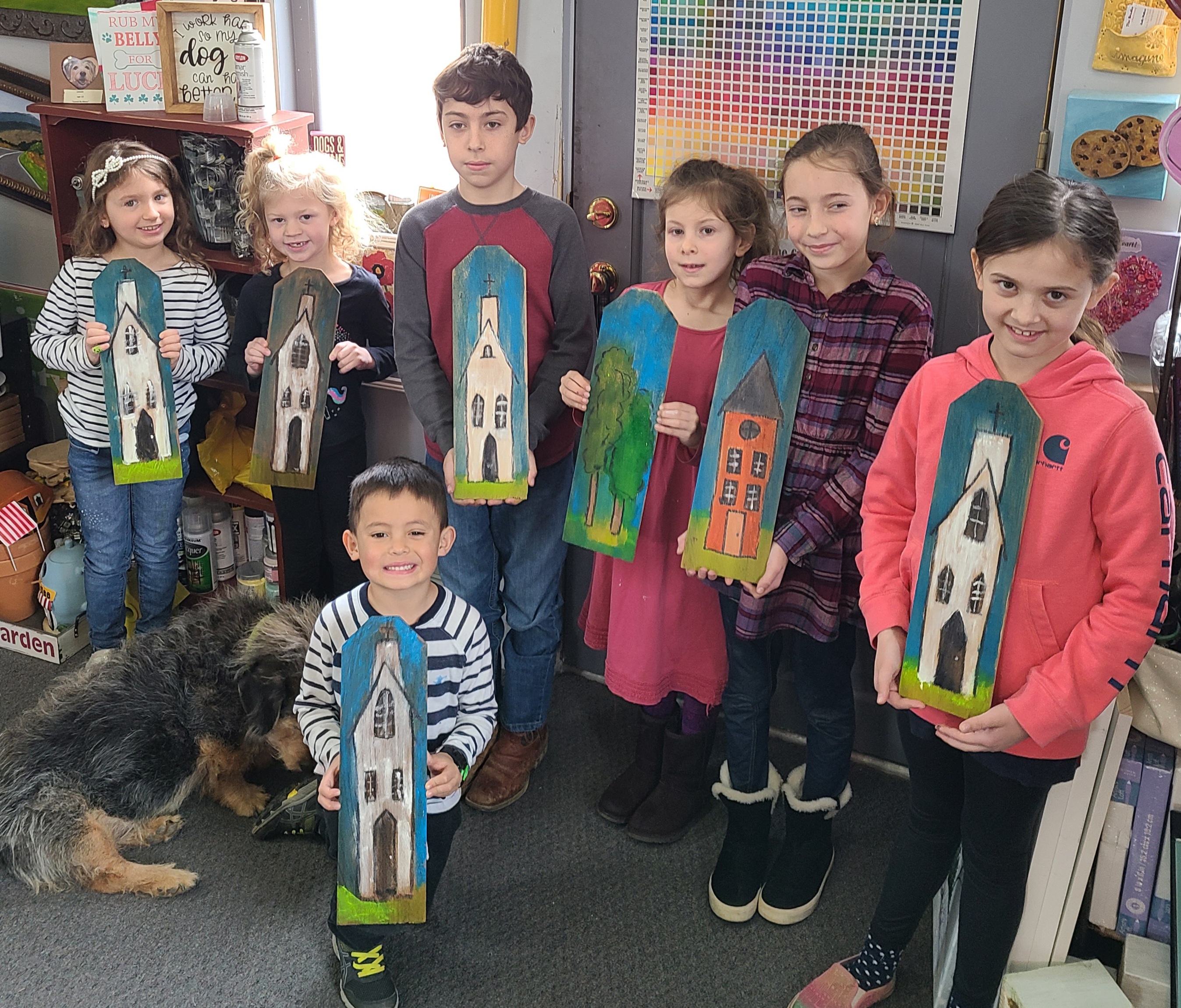 Our Homeschool class finished up a painting they started at the last session of the red cabin in the snow and then did a little folk art painting on a wooden shingle. We like exploring different types of art. Great job everyone!