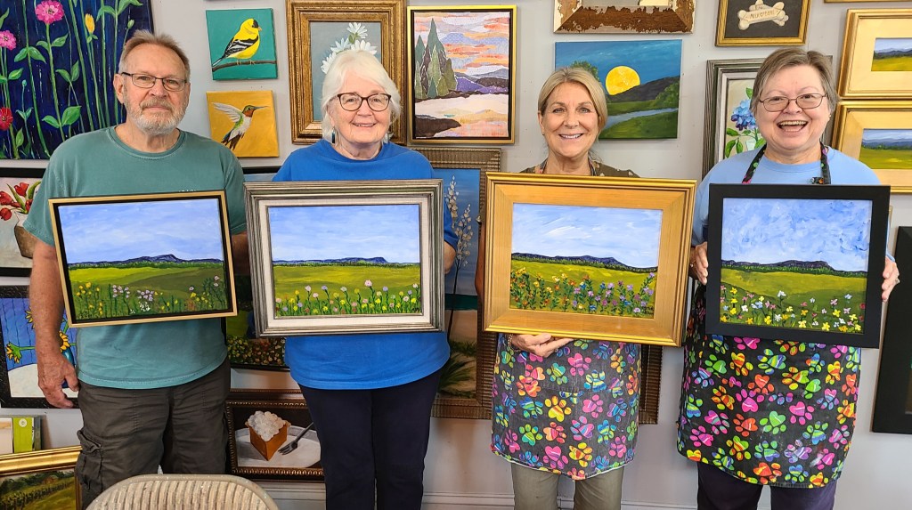 One of my weekly art students, Dianne, treated her visiting family members to a private paint party Thursday morning. She didn’t tell them what they were doing but just brought them to The Studio to surprise them. They were both surprised and delighted that they were able to create a beautiful momento of their visit. Great job everone. It was delightful painting with you!