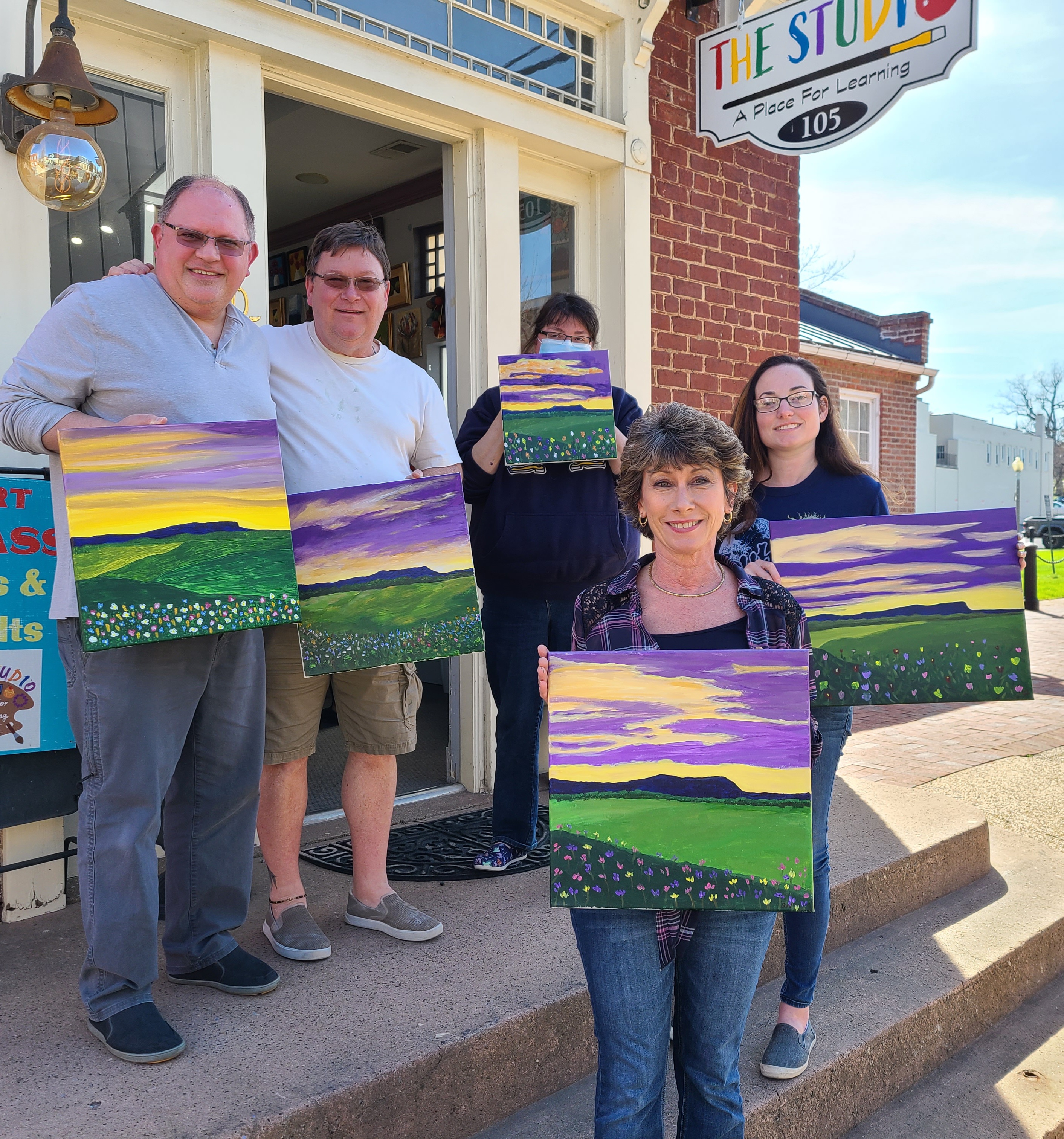 We painted really large canvases at The Studio yesterday. We’d had a request to do a landscape in a large format after we did the large abstracts. So this is the one we did. It’s a view of the mountain looking south from Belle Grove. What a great job everyone did on it. I think they would all agree that painting large is FUN!