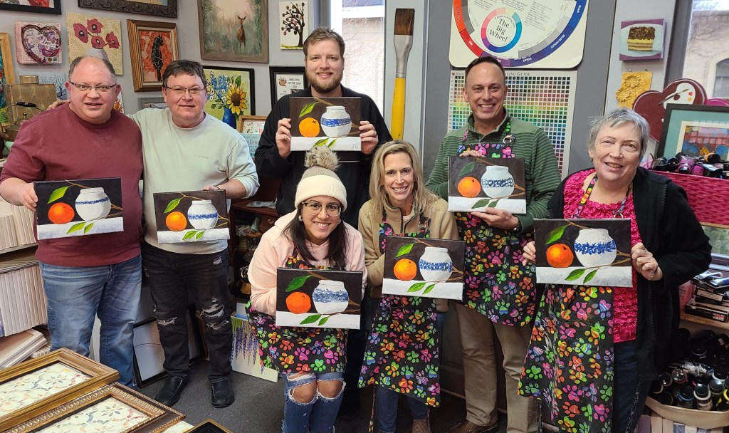 The Still Life with Orange paintings that we did yesterday at the Paint Party turned out terrific! Don’t you think? Look how good everyone did. We even had a new painter in the group. It goes to show that if you want to learn to paint you can! Why not join us on an upcoming event. Check out our schedule here.