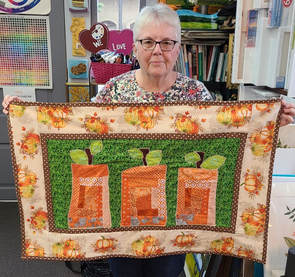 When we had the Pumpkin or Christmas Tree Rag Quilt Class last week Wilma wanted to make hers a table runner instead of a quilt so this is what we came up with. It turned out great! It’s a combination of Quilt as You Go and Applique. Great work Wilma. I love it! We will have a different Table Runner class coming up soon that will be perfect for Thanksgiving. Watch for it.