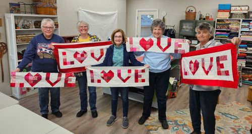 What fun we are having making our series of Table Toppers. The Thursday class met yesterday and created these beautiful “LOVE” Table Runners. Everyone got their basic top finished and some even got to quilting. These were fun to do and we love sering the way everyone puts their pieces together. Can’t wait to see what this group does in March!