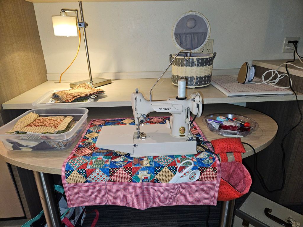 This is what the little Singer Featherweight Sewing machines were made for…travel! They were advertised as portable, and while in today’s terms, eleven pounds may seem heavy, they really are easy to take along. They are perfect for piecing quilt blocks. I love them! This one is a fairly rare 1961 Tan Featherweight… named Barbara Ann for my mom. She’s traveled with me to the last two retreats. I try to rotate the Featherweights I have so they all get used and I can keep them maintained. I have 6 now…Oops, how did that happen???!!! Did I mention that I love these little machines?