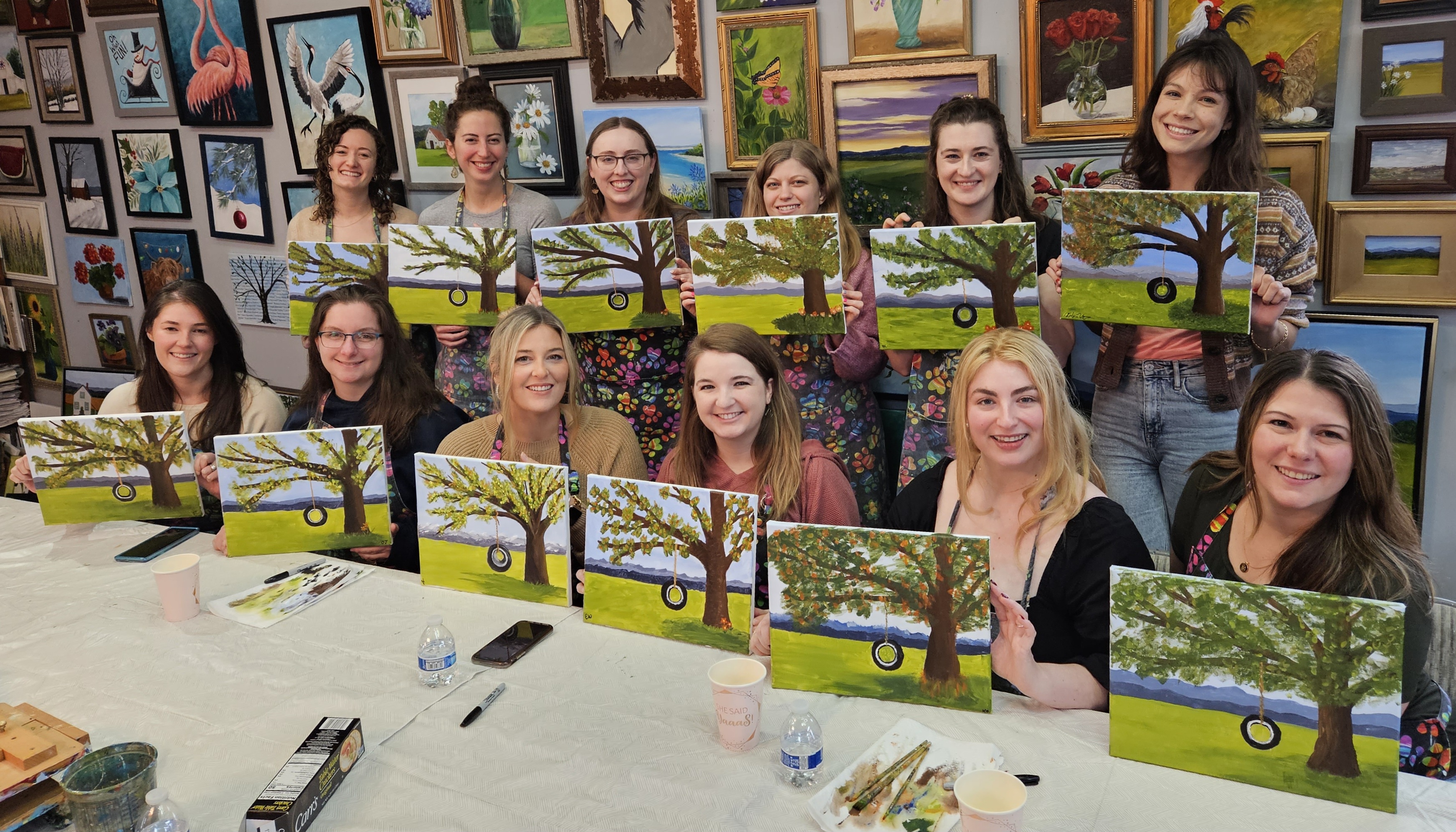 Sometimes we get requests for family members to come to a regular weekly class to paint together especially in the summer when people have time or are in from out of town. Yesterday was one such case. These three ladies chose to paint the “Tree Swing” and there was lots of fun and laughs. They did a terrific job and can you believe a couple of them had never painted before. Awesome!